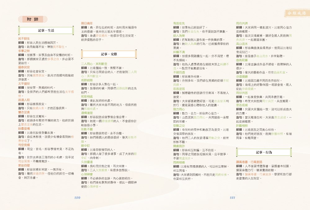除了正文所介紹的成語外,在每一冊的最後,都附錄整理超過200個的成語,本書附錄類型很多,例如:生活、交際、行為、軍事、寓言、歷史、空間、時間、動物、植物、環境、氣象等,不僅附上解釋,還有一個例句,建構成語的正確使用時機。