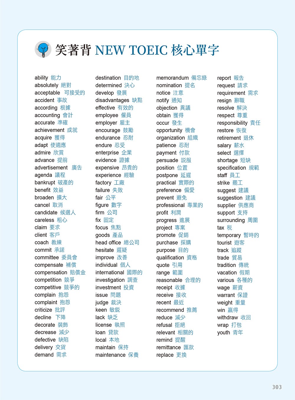 擁有足夠的字彙量,是看懂考題的第一步。本書特別標示出「常考核心字彙」以及「必備基礎字彙」,這些單字一定要熟記。