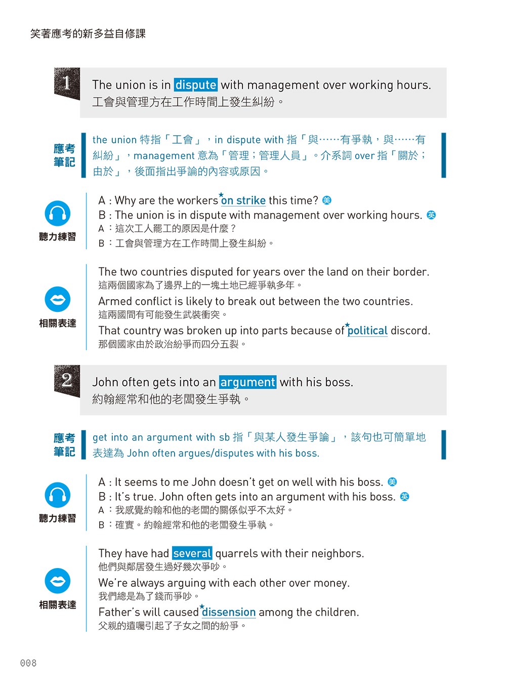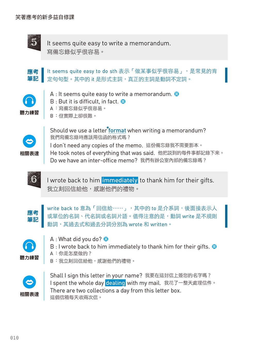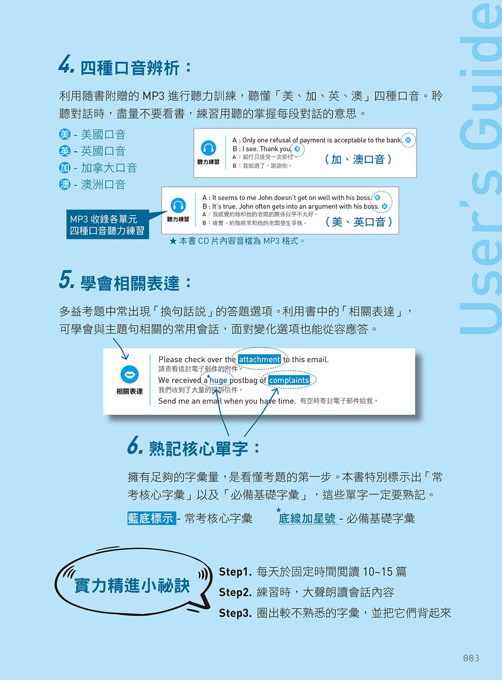 利用隨書附贈的MP3進行聽力訓練,聽懂「美、加、英、澳」四種口音。聆聽對話時,盡量不要看書,練習用聽的掌握每段對話的意思。