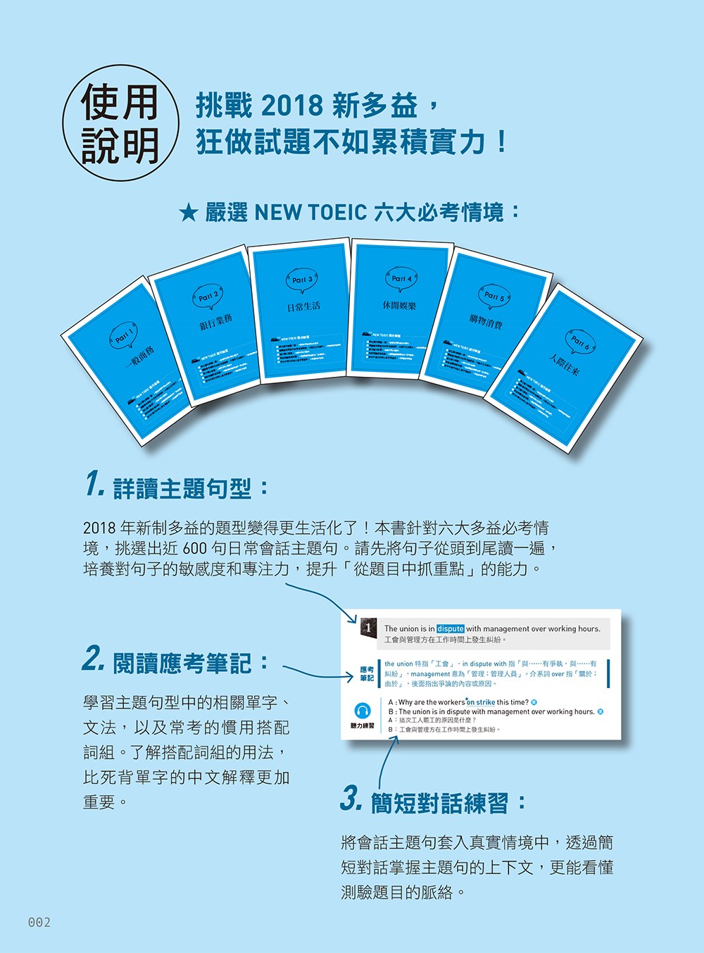 2018年新制多益的題型變得更生活化了!本書針對六大多益必考情境,挑選出580句日常會話主題句。請先將句子從頭到尾讀一遍,培養對句子的敏感度和專注力,提升「從題目中抓重點」的能力。