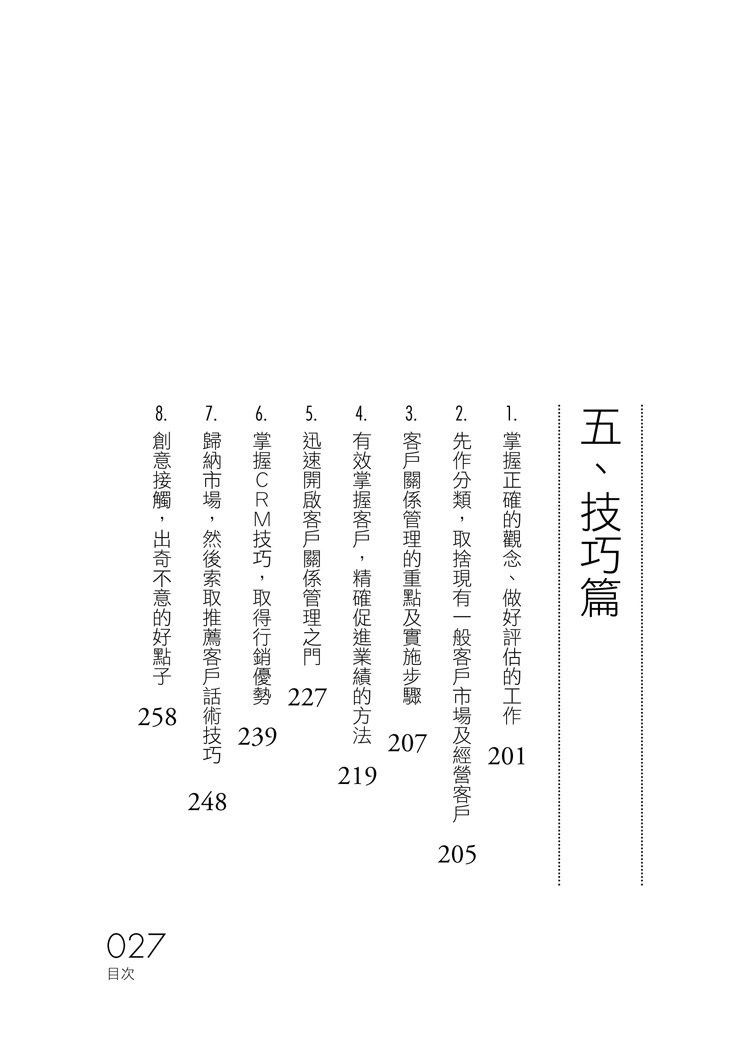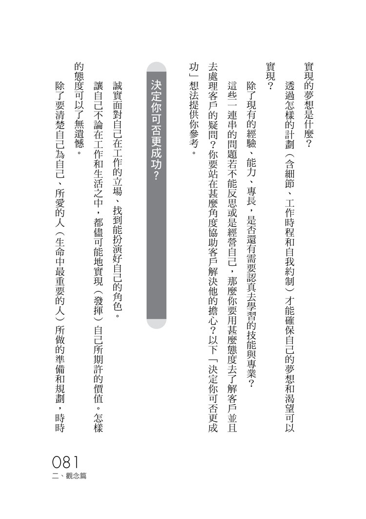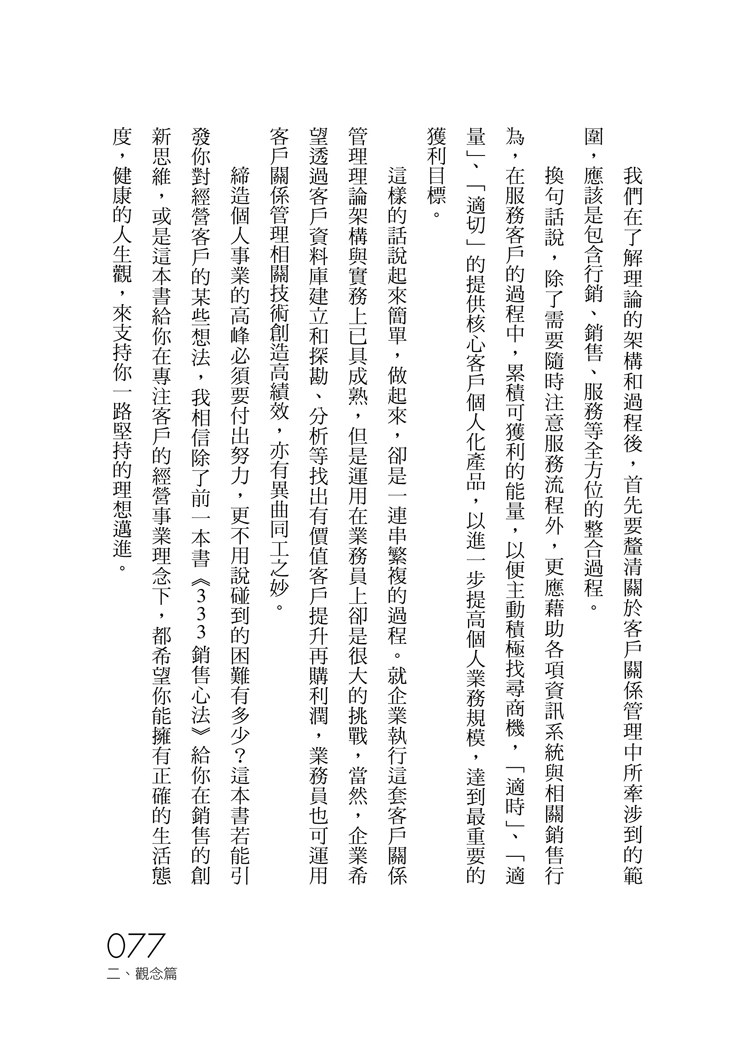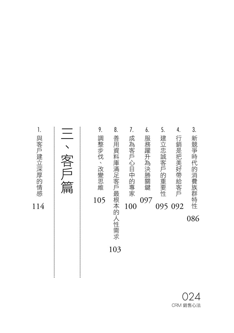 讓您在行銷過程中掌握訣竅,依客戶屬性、期望、能力及時間動態,提供客戶適合其需求的解決方案,並經由管理好客戶關係創造再次銷售機會或拓展新客戶;對於要在銷售事業持續保有輝煌績效的菁英,真心推薦這本書給各位!──宏泰人壽總經理/金段宇