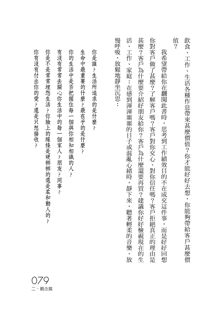 客戶會忘記業務人員說的話、做的事,但很難忘記業務人員給他的感受。因此,客戶內心的「感受」才是真正的核心價值。好好體會並實踐本書的方法,你可以讓客戶成為永遠的擁護者。──凱基證券董事長/魏寶生