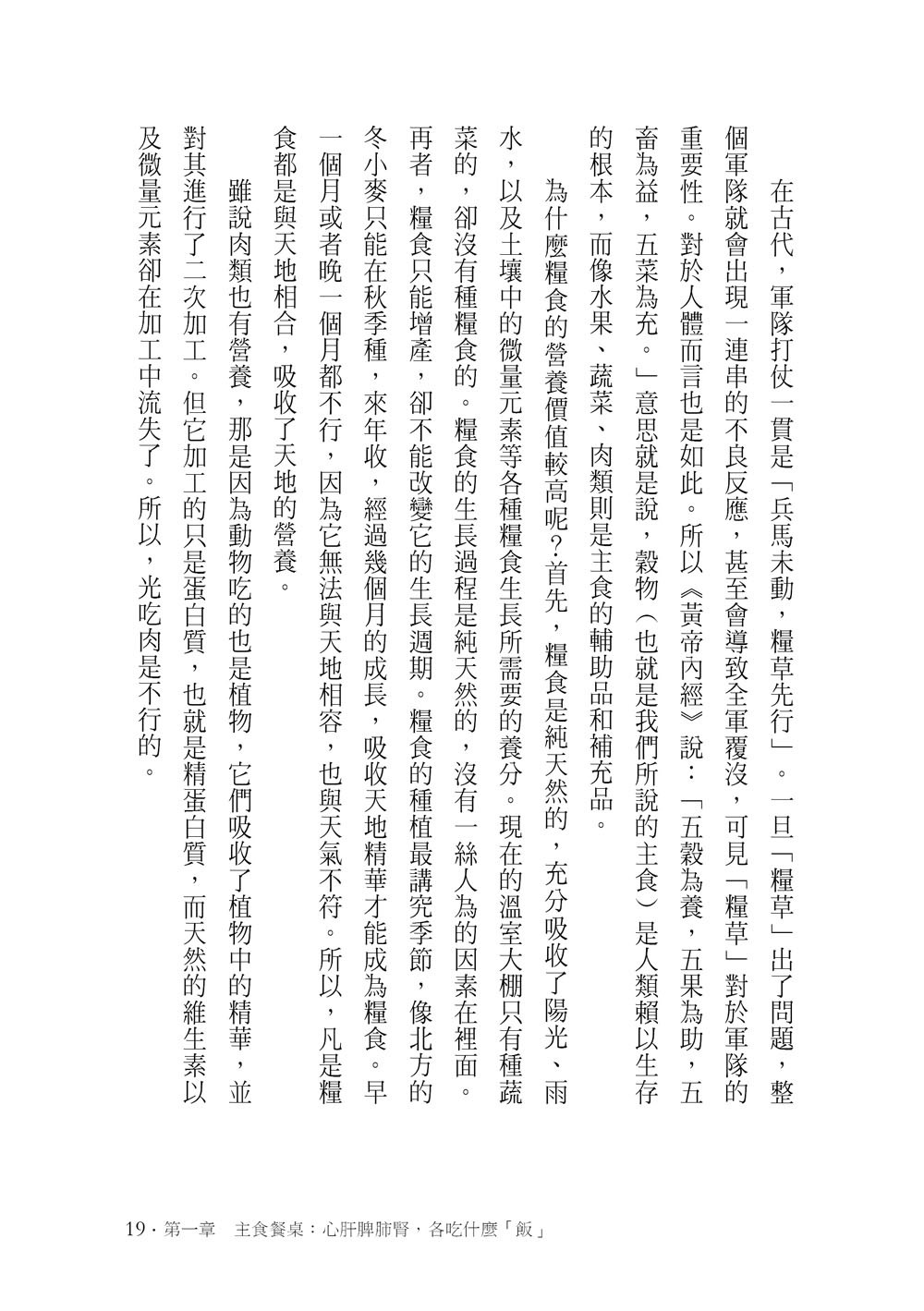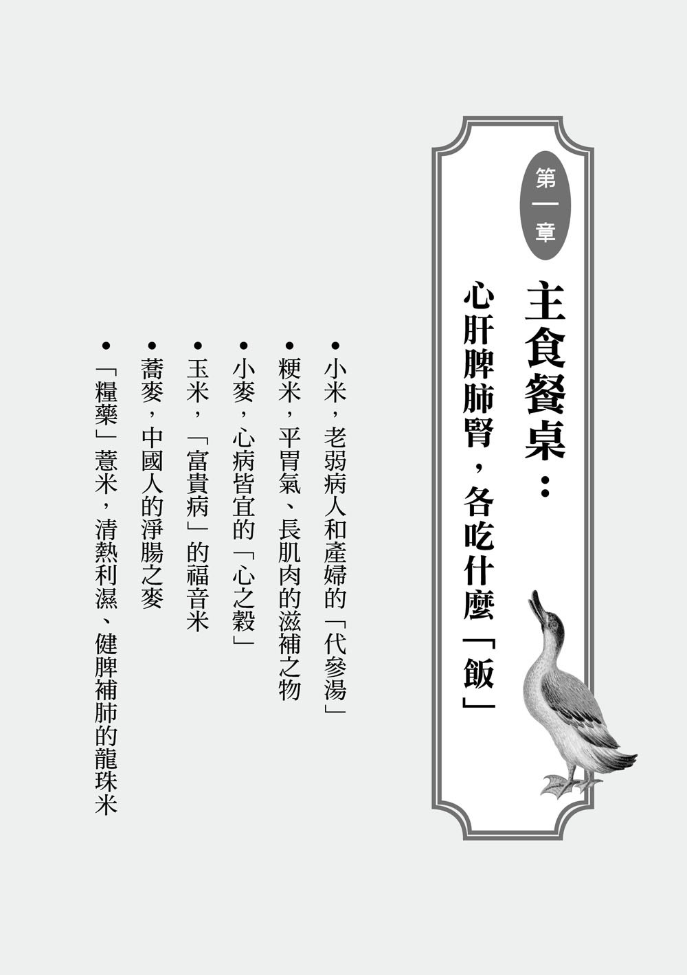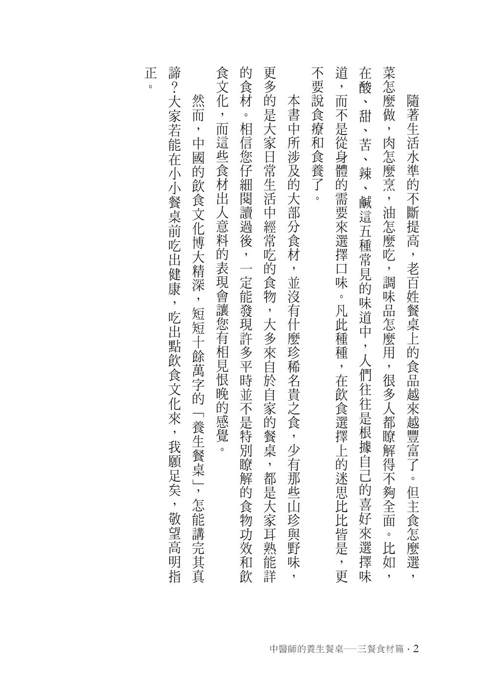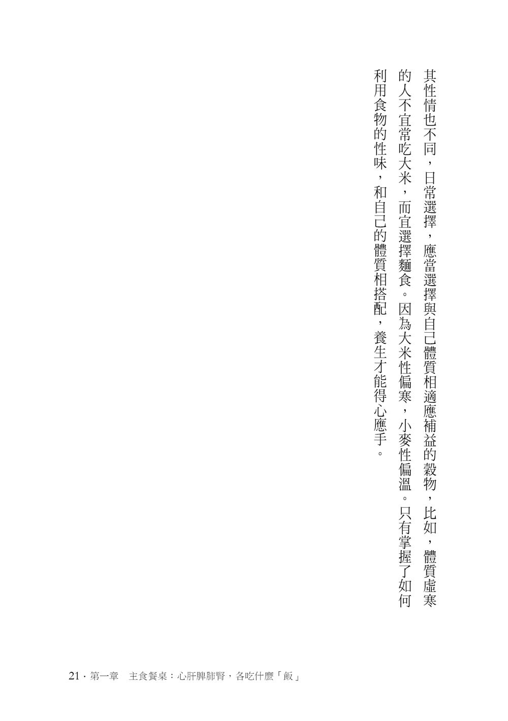 養生專家帶你全面認識米麵主食、酸甜苦辣、五色豆類、調味佐料、芋頭番薯、雞鴨魚肉、動植物油、各式蛋類……等三餐食材的中醫典故、民諺俗語和烹調方法,同時深入了解食材的四性五味、食養功效、食用禁忌,以及食材挑選、處理及保存方面的小知識,還有數十道美味養生食譜及彩色成品圖片,讓每天的三餐,都成為調理身體的好機會!