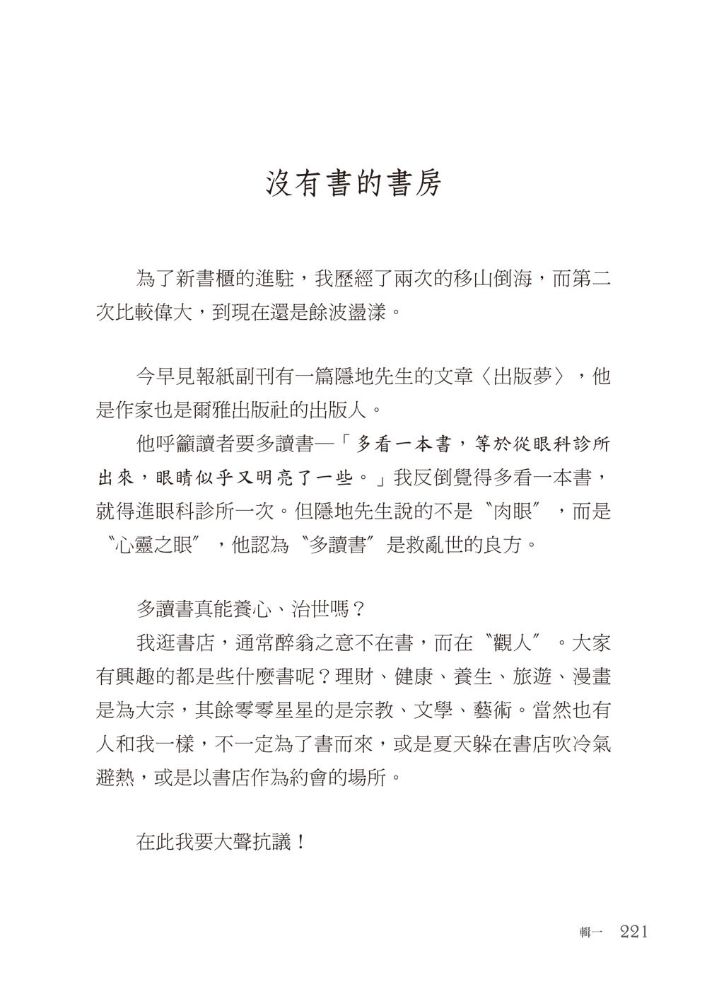 從那個時候開始,我的生命產生了質變,我勤於讀書、寫作,我把寫作視為編織夢想,我織的夢可能穿梭在不同的時空、不同的生命,也可能幽深曲折,尋不著門,也沒有路徑可循。我每織好一個夢,便把他撒在雲端,我願它化為和風、小雨、細雪、雷電,或化為野花、溪流、蟲鳴、鳥音,或化為一杯濃香的咖啡,或化為哲人的囈語,或化為夜深時照臨大地的月光,或崩裂為宇宙中的微塵……。