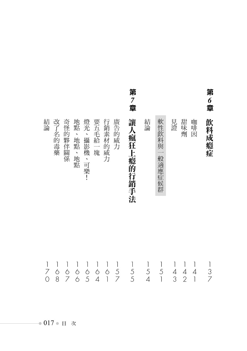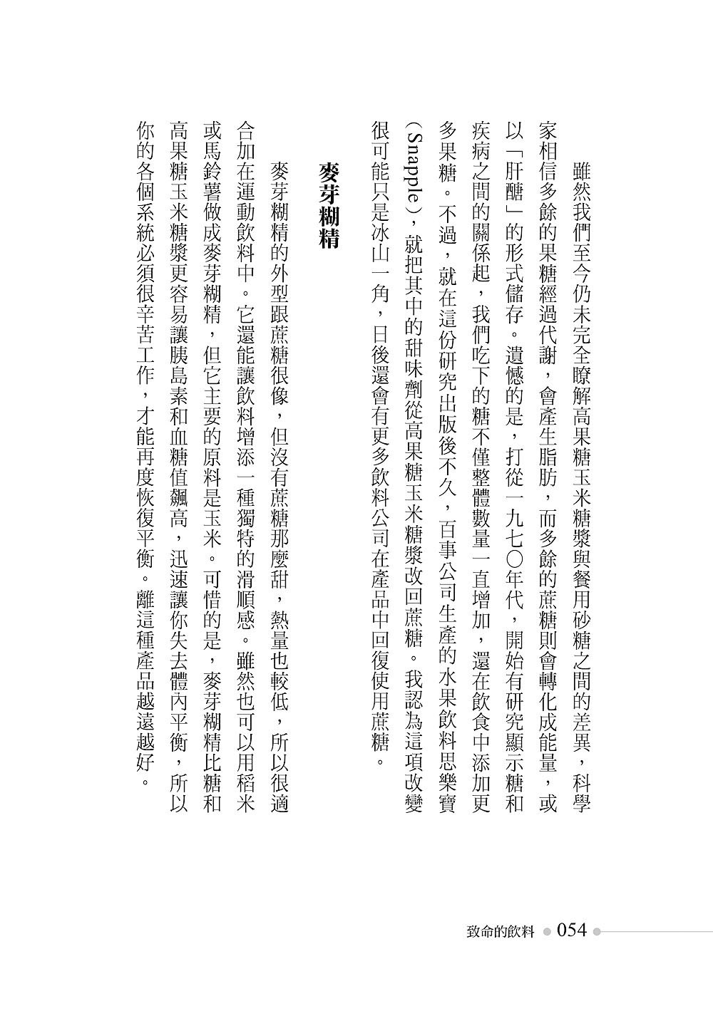 當然,也許你早就知道含糖飲料對身體不好,但就是沒辦法不喝,為什麼?!也許這不是你自制力的問題。也許是因為廠商知道很多默默操縱你的方法,而你並不知道。《致命的飲料》為你詳細整理糖及其他飲料成分對身體健康可能造成的危害,並指出飲料廠商如何透過產品中的成分、不斷加大的容量、感性的行銷手法、密集的舖貨地點,以及公關遊說的手段,讓你我和無知的孩童養成喝含糖飲料的習慣──而這個習慣就跟抽菸、酗酒一樣致命!