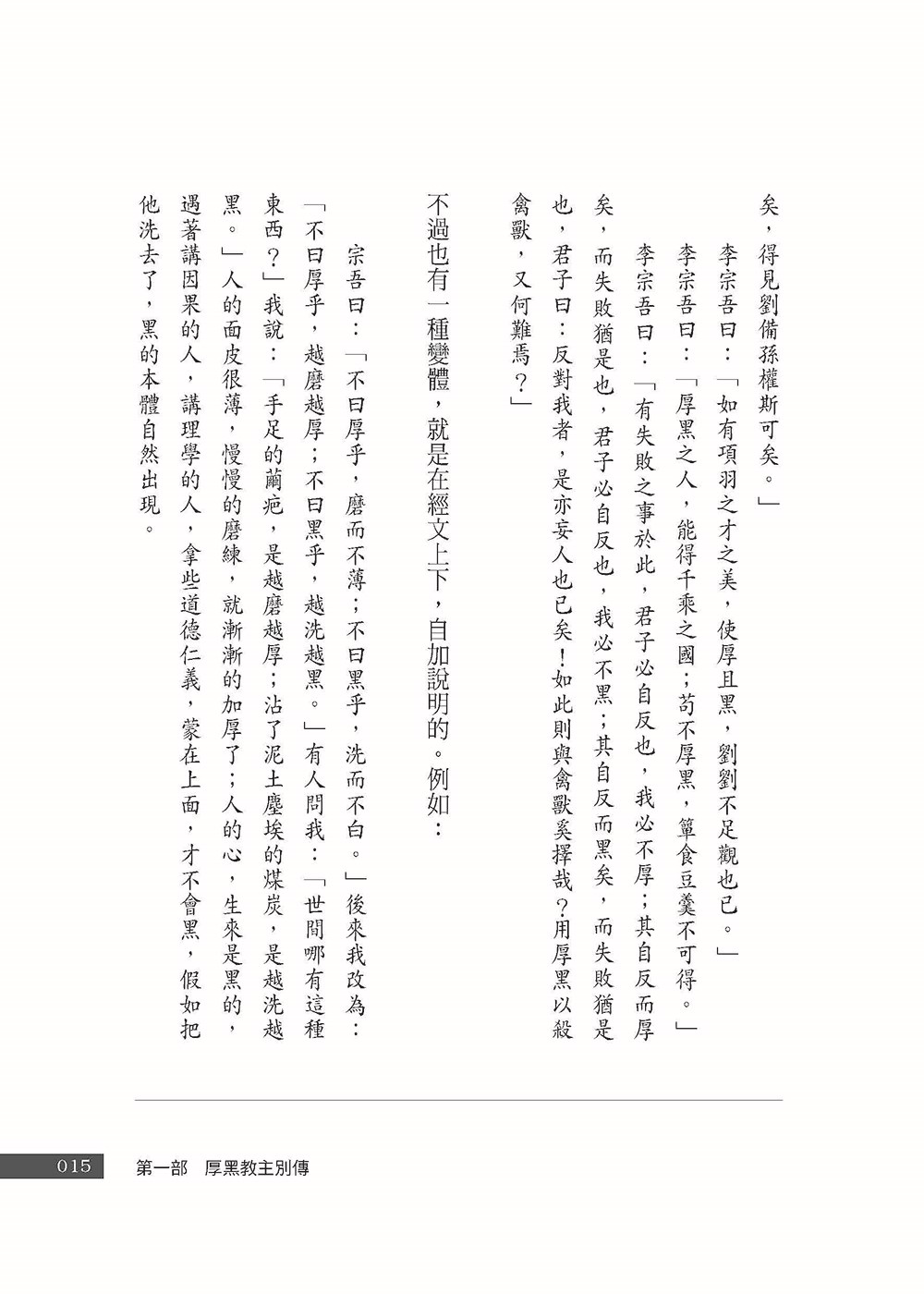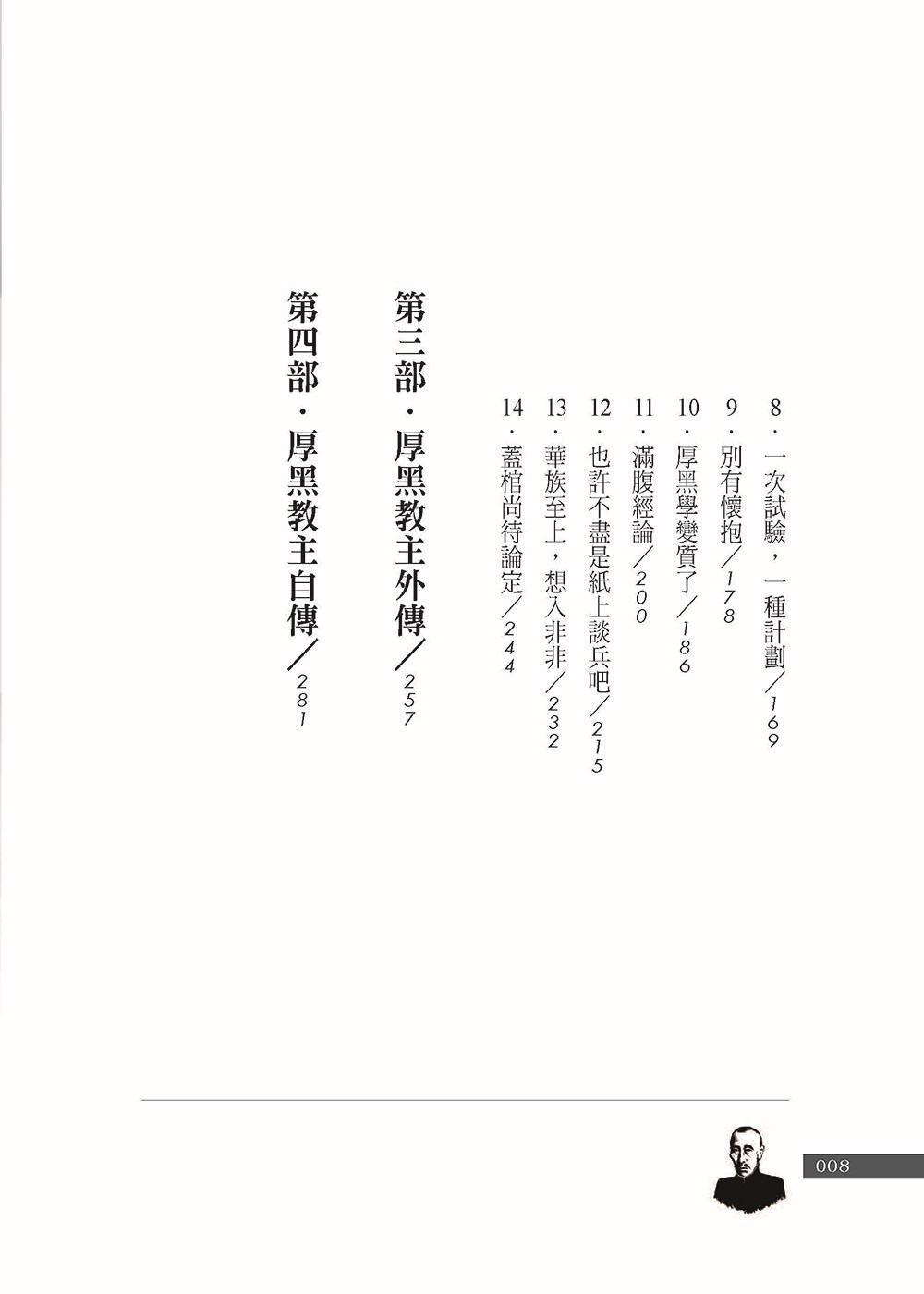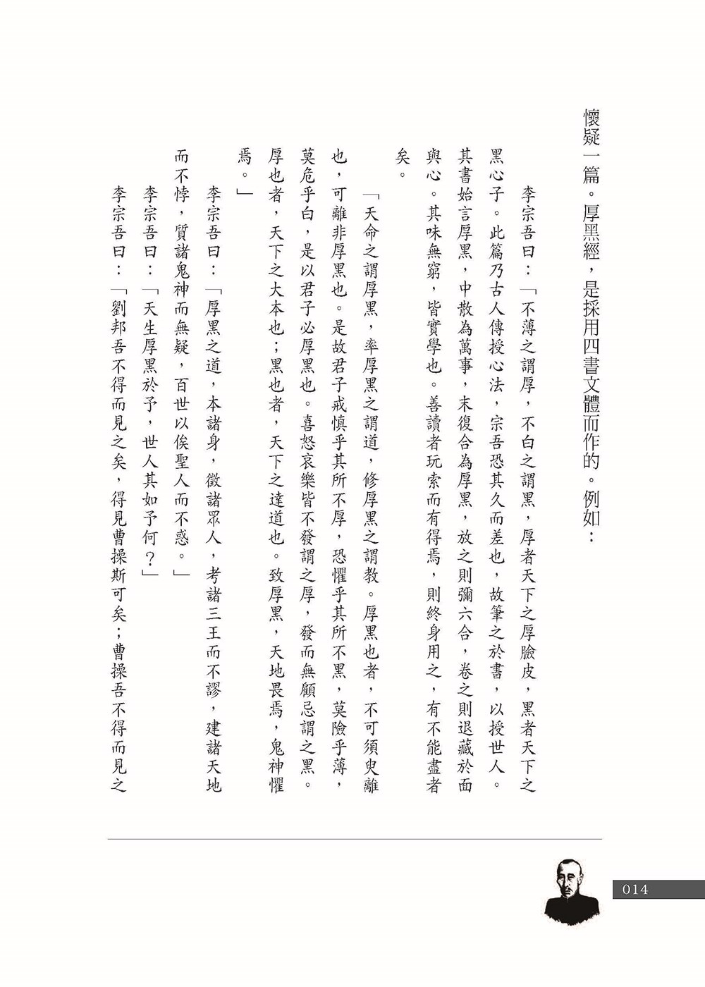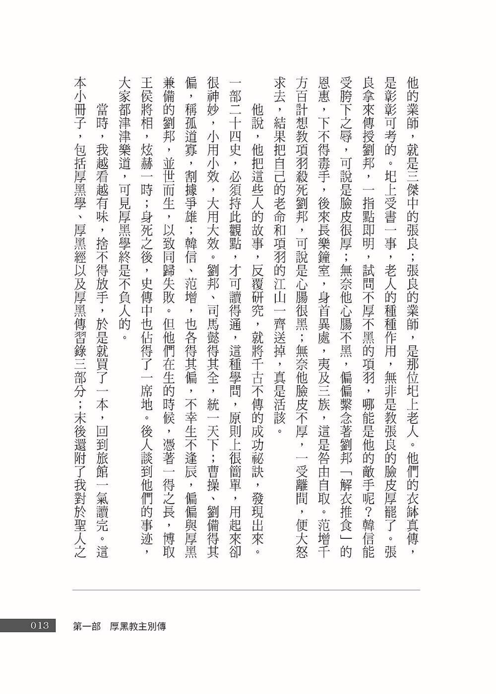 在厚黑學一書中,闡述臉皮要厚而無形,心要黑而無色,這樣才能成為英雄豪傑,以劉邦、項羽、曹操、劉備、孫權、司馬懿等人物實例為主線,探討論證厚薄與黑白如何影響成敗得失。