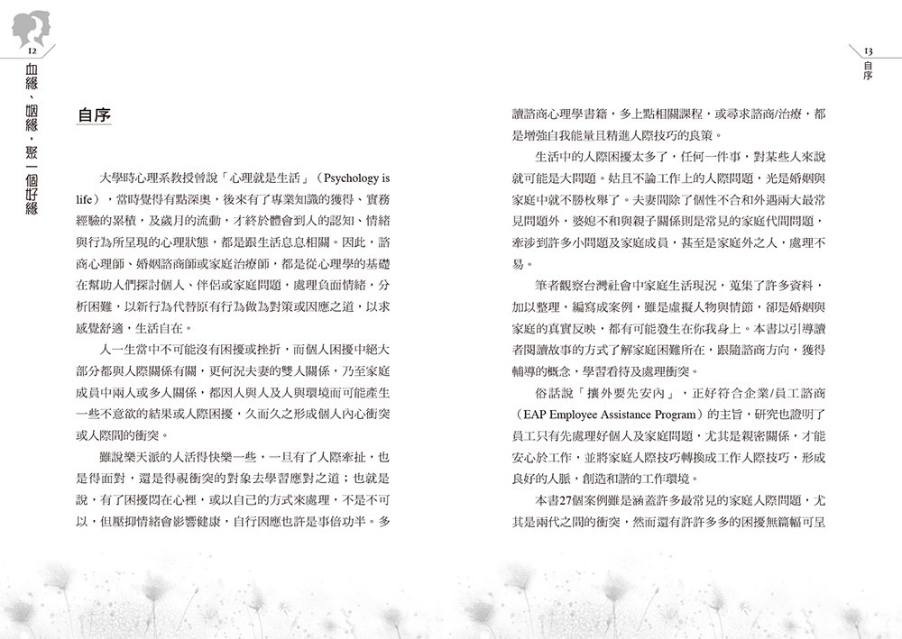 夫妻間除了個性不合和外遇兩大常見問題外,婆媳不睦與親子關係也是常見的家庭代間問題,本書27個案例涵蓋許多常見的家庭人際問題,尤其是兩代之間的衝突,有待讀者閱讀完畢後,可以舉一反三,試著處理自己的問題,也可幫助家人或朋友紓解情緒,和解衝突。