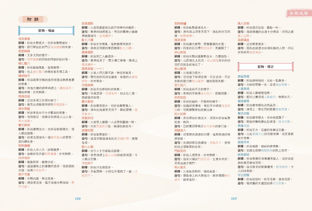 除了正文所介紹的成語外,本冊最後都附錄整理超過200個的成語,其類型包羅萬象,例 如:場面、聲音、色彩、建築、形態、珍寶、比較、變化等,不僅附上解釋,還有一個例句,建構孩子使用成語的正確時機。