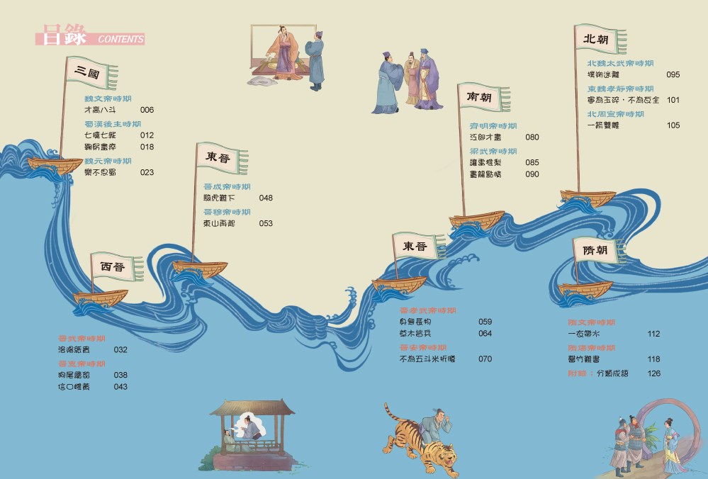 精心安排的目錄,可以看出本書介紹的年代是從三國到隋代,從目錄中可看出依照時間架構依序排列成語,讀過目錄,就能了解中國歷史的更迭,每一則故事中,另有相關成語以醒目顏色標註,讓你一目了然。
