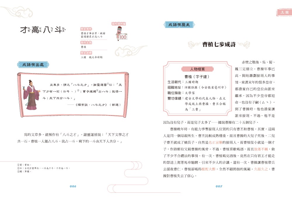 此書撰寫的年代範疇是從三國到隋朝,許多典故來自經典典籍,例如:才高八斗、江郎才盡、畫龍點睛、東山再起等,雖然內容中有些文字較為罕見,但下方皆有淺顯易懂的白話譯文與註解,讓讀者像讀故事般,輕鬆閱讀無困擾。