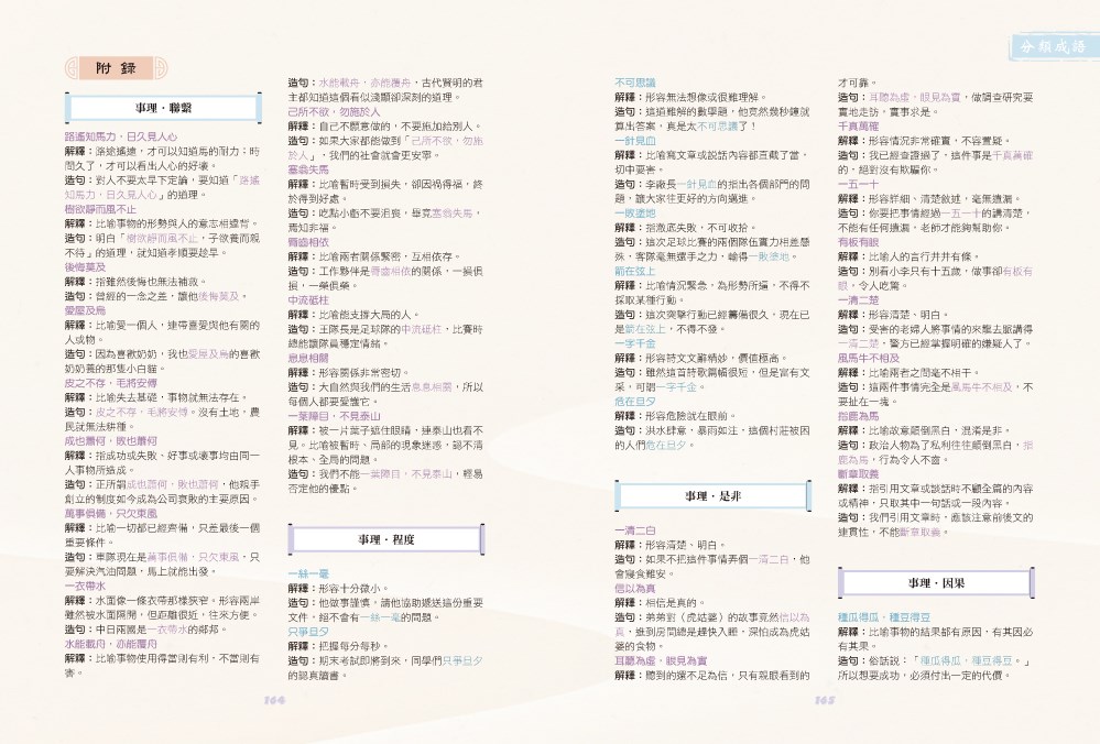 除了學習主要成語外,該成語的逐字解釋、成語釋義、相似與相反成語並列,以及例句,皆能建構讀者使用成語的正確時機。