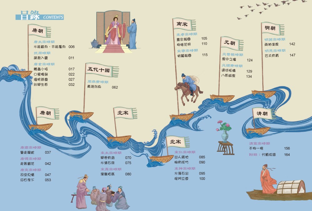 精心安排的目錄,從「唐朝」介紹到最後一個封建王朝「清朝」,從目錄中可看出依照時間架構依序排列成語,讀過目錄,就能了解中國歷史的更迭,每一則故事中,另有相關成語以醒目顏色標註,讓你一目了然。