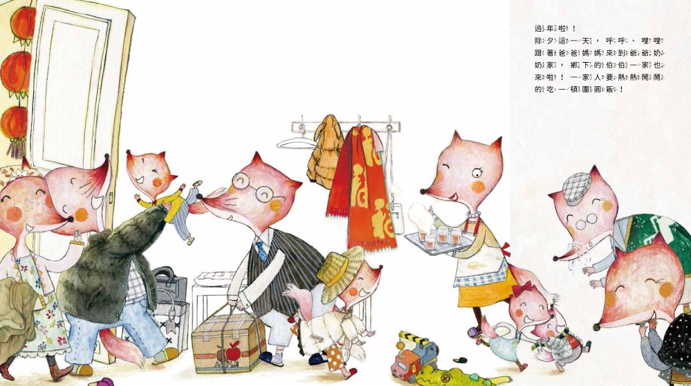 以農曆新年為背景,讓孩子了解這個傳統節日我們會做哪些活動?除了除夕當天一家人要一起吃團圓飯,還會寫春聯、貼春聯、提燈籠、穿新衣、戴新帽、放鞭炮等好多活動。除此之外,透過對話內容,可以讓孩子了解,原來過了一個年就代表又要多一歲了,給予計算年紀的觀念;以鄰居的奶奶送臘腸一事,讓孩子理解,農曆新年時,親戚朋友時常會互相送禮道賀;用快遞叔叔回老家過年的例子,讓孩子明白,新年時,在外地工作的人們也會回到老家與家人團聚,了解新年是一家團圓的重要日子。