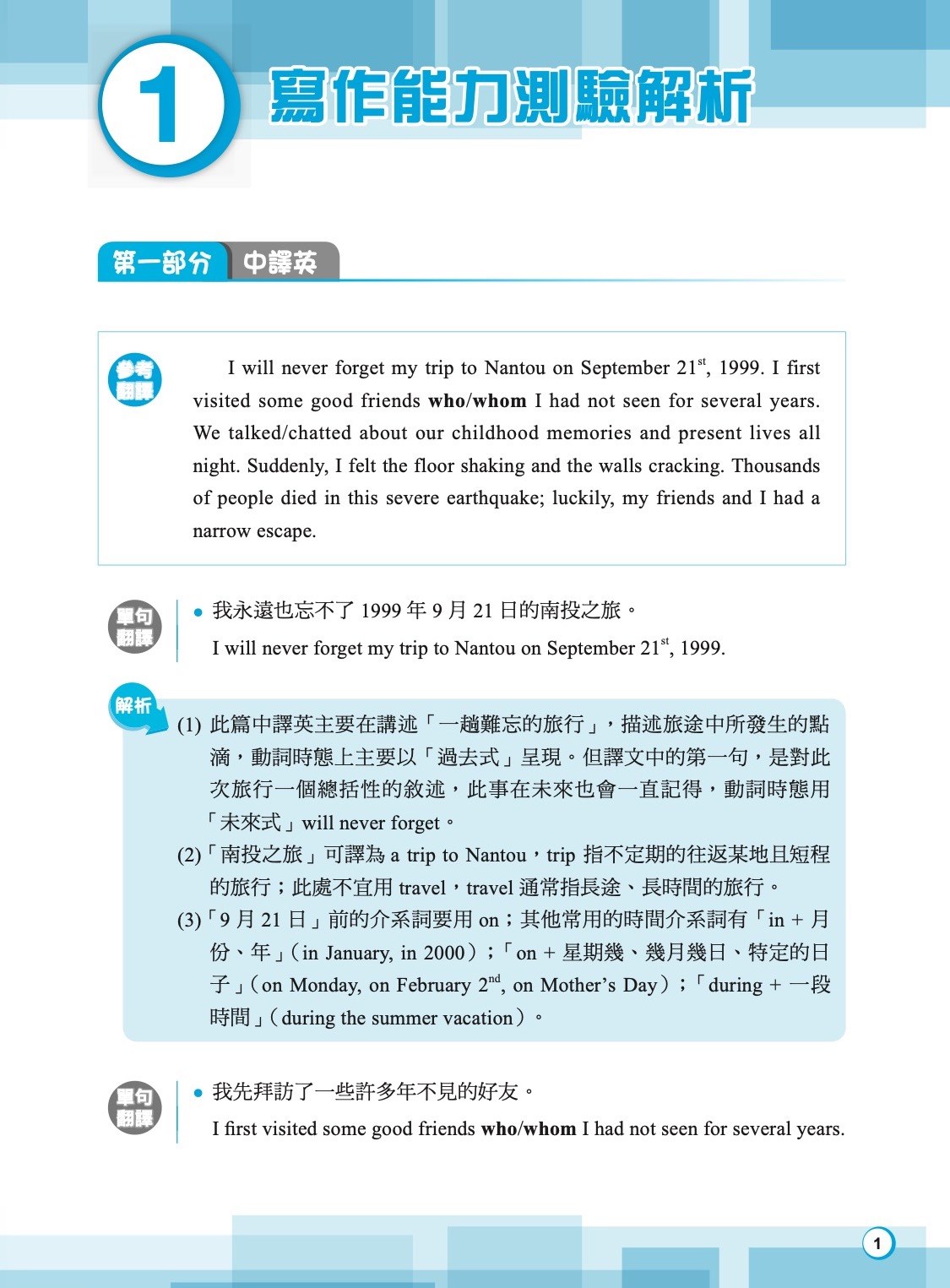 名師逐題解析,提點重要文法觀念,分享解題技巧,並詳列重要字彙、片語、句型,讓您逐步掌握解題關鍵,面對任何題目都輕鬆破解。