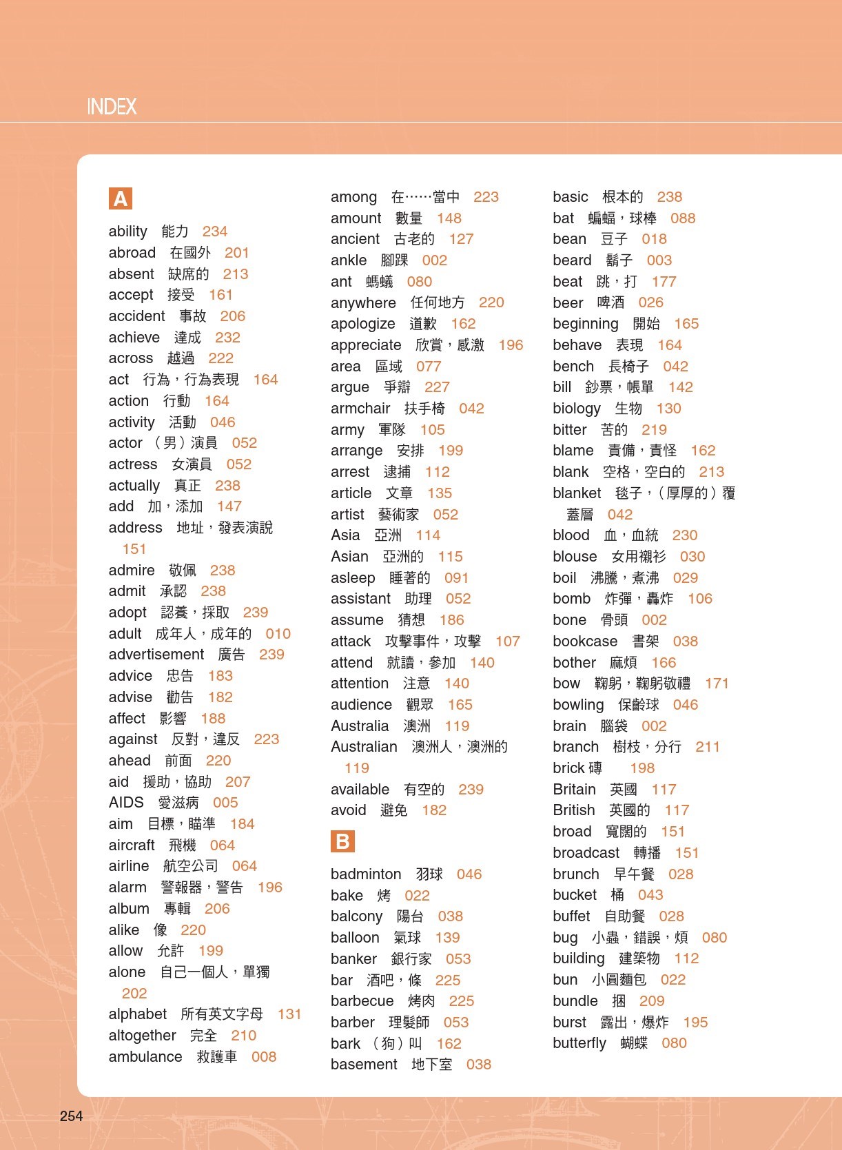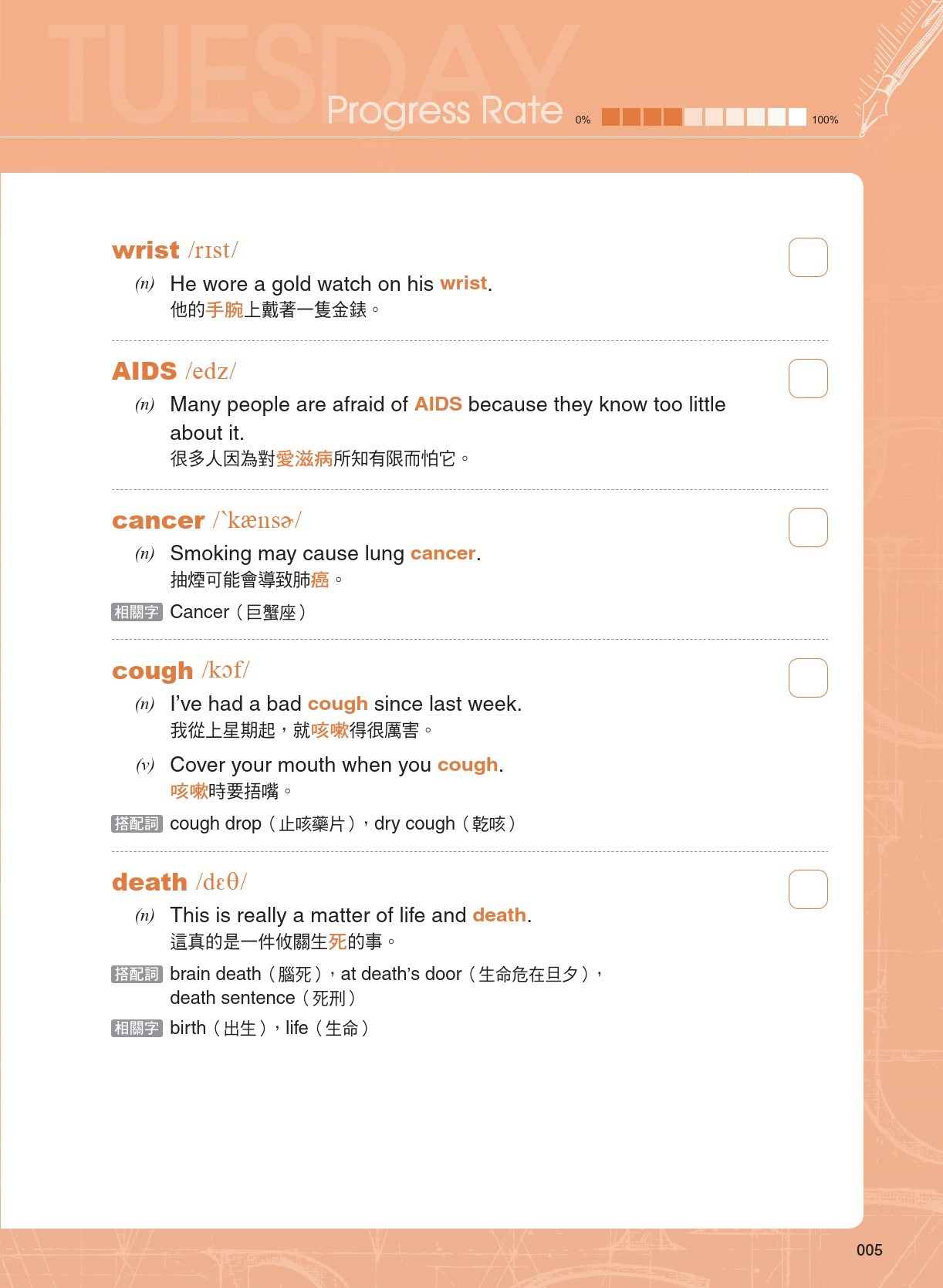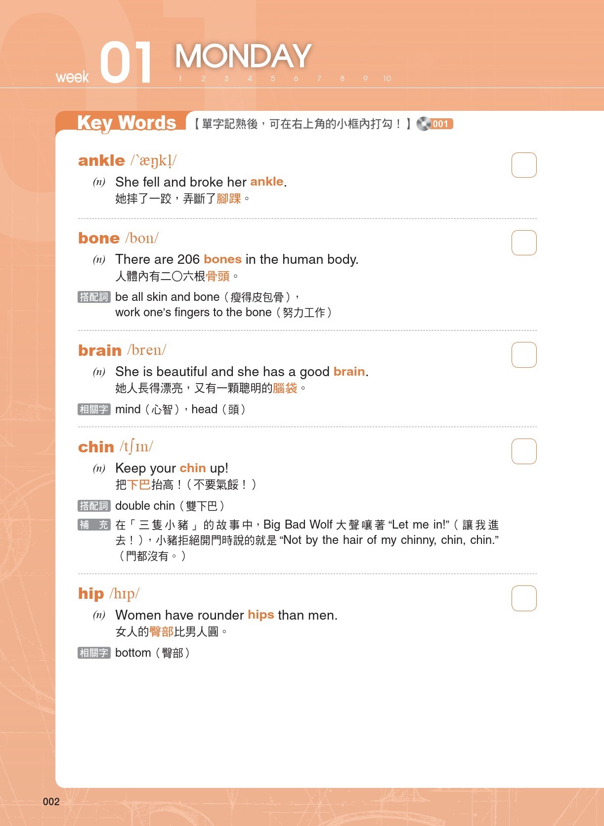 單字計劃(Key Words)—學習者可先將已認識的單字打勾作記號,然後專注在不熟悉者。每個單字皆附上例句以說明該單字的用法,特別強調該單字與其他字彙的搭配使用。