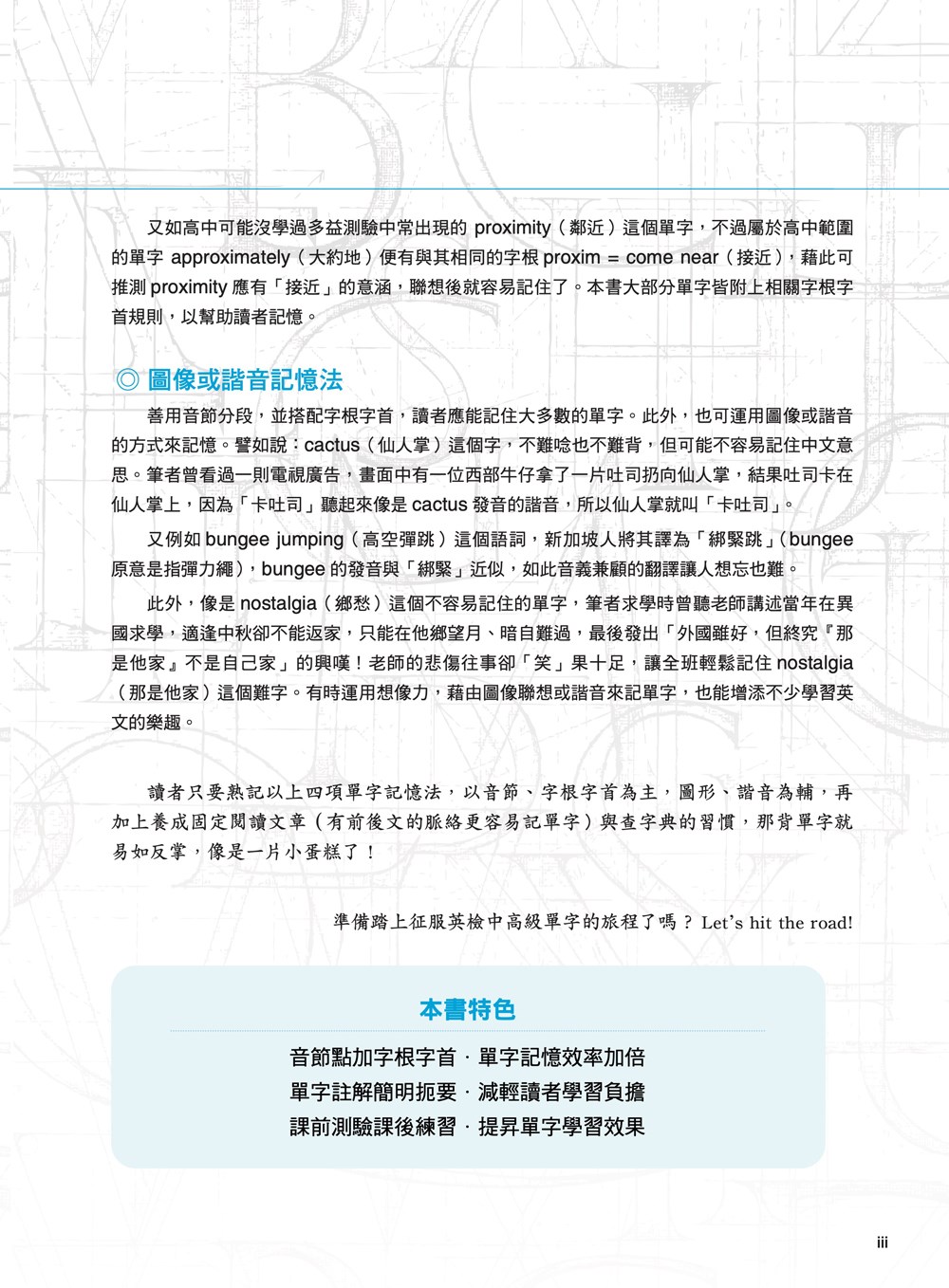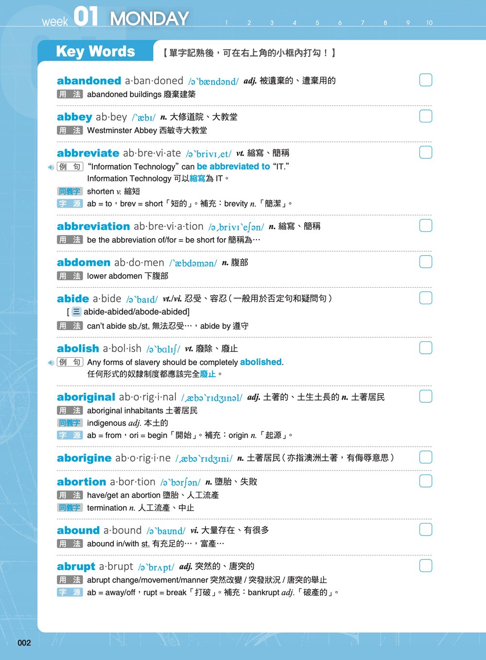 ◎每週學習前有預先測驗,週一到週六學習單字,週日驗收成果,扎實地協助考生準備考試。