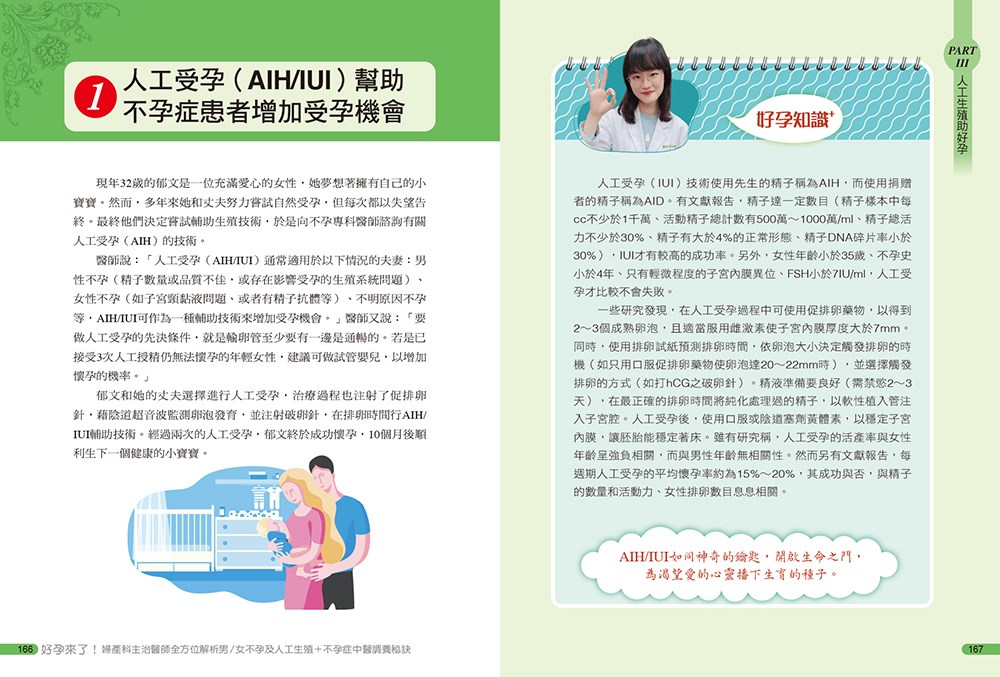 超詳細──本書分三篇。第一篇「女性不孕」,羅列女性不孕的問題及解方;第二篇「男性不孕」,以案例說明男性不育的原因及對策;第三篇「人工生殖助好孕」,詳細說明人工生殖的各個環節及流程,以及最新的AI技術如何幫助不孕夫妻圓夢。
