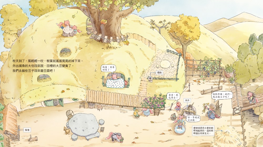 本書以秋天為背景,在大豆成熟時,和繪本中的主人翁一起採收大豆,製作許多豆製品,例如:豆腐、豆皮、豆花、豆腐乳、豆漿等。