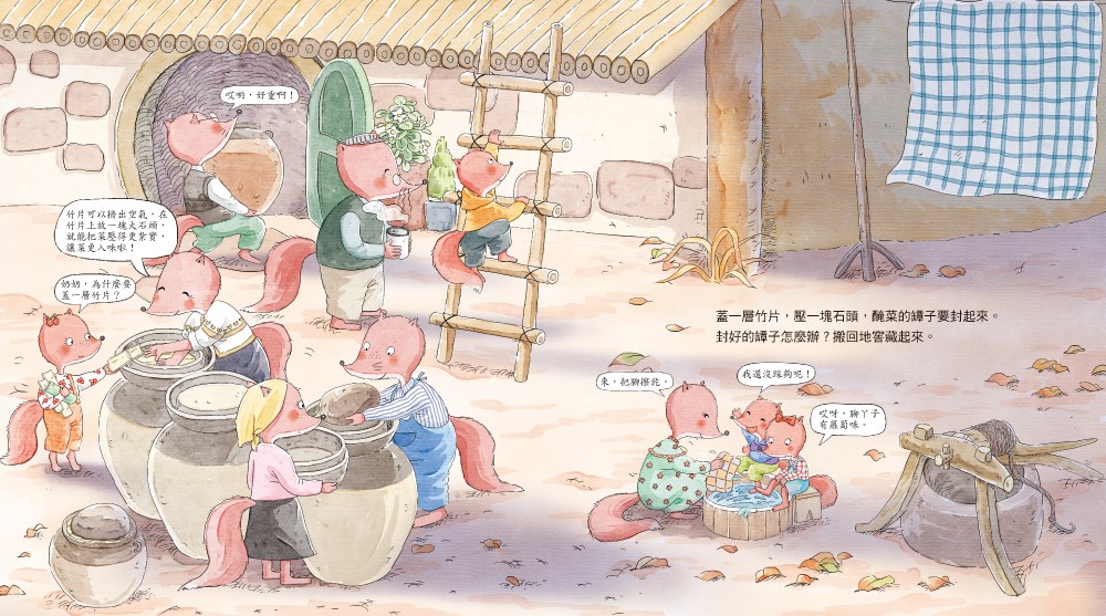 故事中,狐狸一家人趁著天氣好準備入冬的時節,趕緊去摘些蔬菜回家,製作鹹菜。從備料、挑菜、洗淨、搬出大大小小的罈子,然後封罈醃製,最後變成桌上的配菜,一家人開心品嘗。也在書中最後的跨頁,統整醃鹹菜的製作過程,讀者也可透過這些步驟,試著與家人做做看。