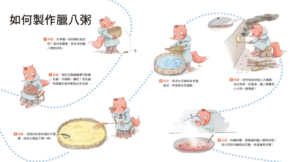 故事中,狐狸一家人趁著好天氣,忙著清洗、挑選穀物,也忙著晒棉被,為寒冷的冬天做足準備。每個畫面都能感受到和諧的家庭氣氛,同時,他們也跟隨時令,運用當季食材。最後一個跨頁,還提供製作臘八粥的程序,有興趣的讀者也可以準備材料,一起動手做。