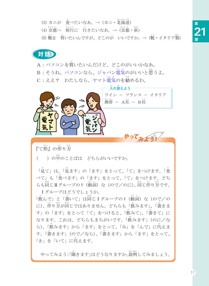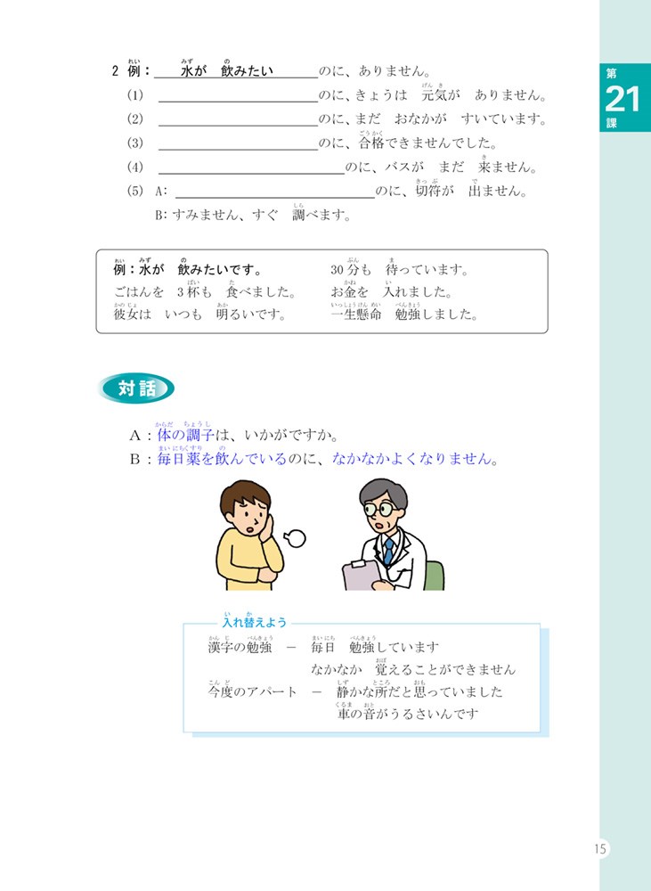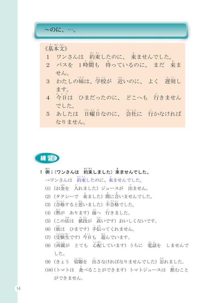 2‧3頁/4‧5頁/6‧7頁-基本上一個文型兩頁,剛好成左右兩頁。以「基本文」、「練習」、「対話」、「やってみよう」等單元構成。
