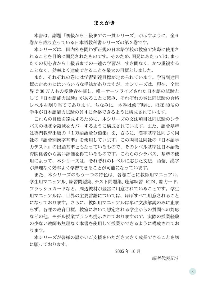 本教材在每一冊都訂有學習達成目標,有鑒於現今擁有全世界30萬考生,且唯一被認可的「日本語能力測驗」為一項值得參考的資料,故將其考試及格的級別分配到各冊當中,因此學習完初級2的同學應該有80%能通過N4的能力測驗。為達成此目標,本系列的文法項目涵蓋了日本語能力測驗大綱的所有領域。