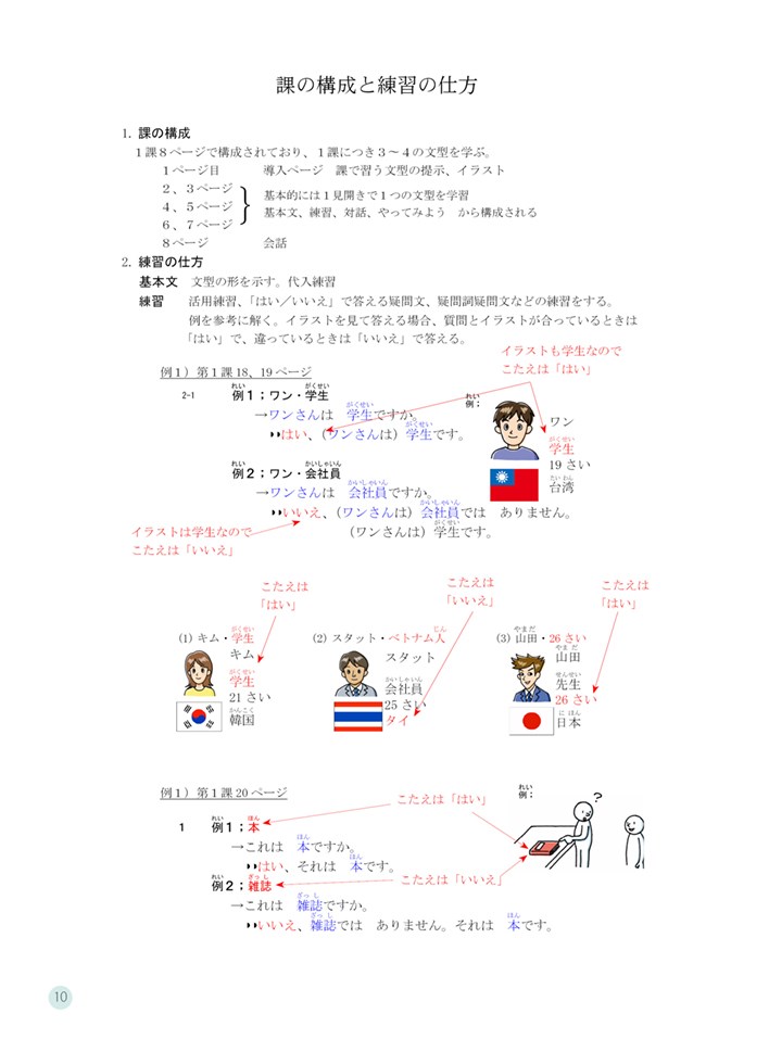 2‧3頁/4‧5頁/6‧7頁-基本上一個文型兩頁,剛好成左右兩頁。以「基本文」、「練習」、「対話」、「やってみよう」等單元構成。