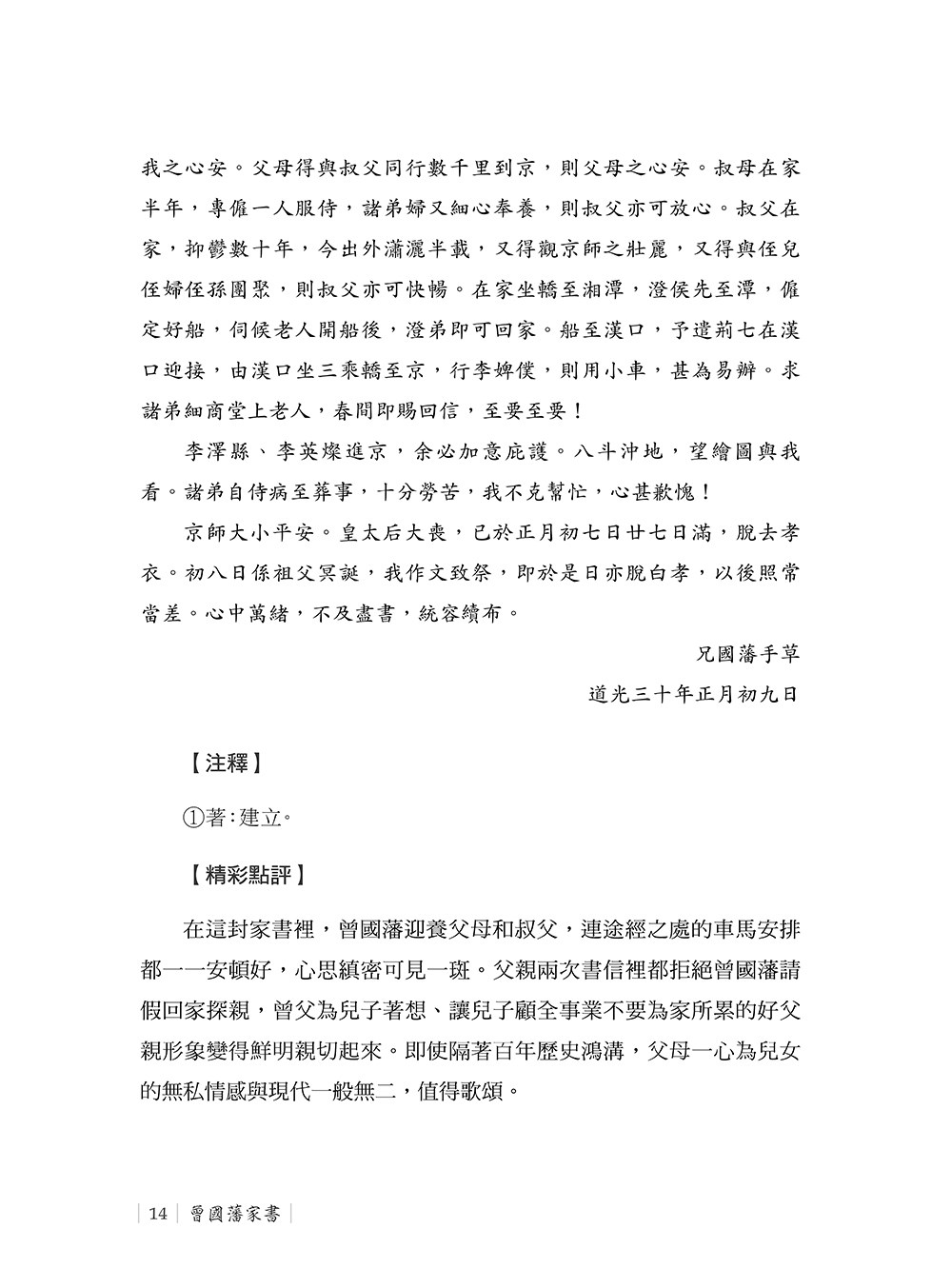 曾氏家書行文從容鎮定,形式自由,隨想而至,揮筆自如,在平淡家常事中蘊含真知良言。他的家書不僅是一部記錄家常的書信集,也是研究曾國藩其人及這一時期歷史的重要資料,更是一部蘊藏著為人處世、持家教子智慧的書。