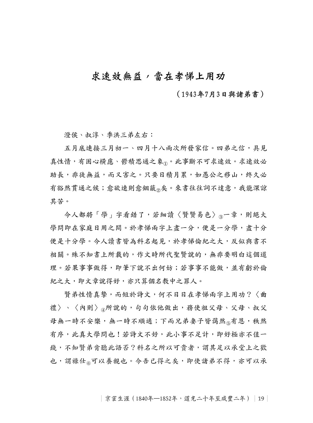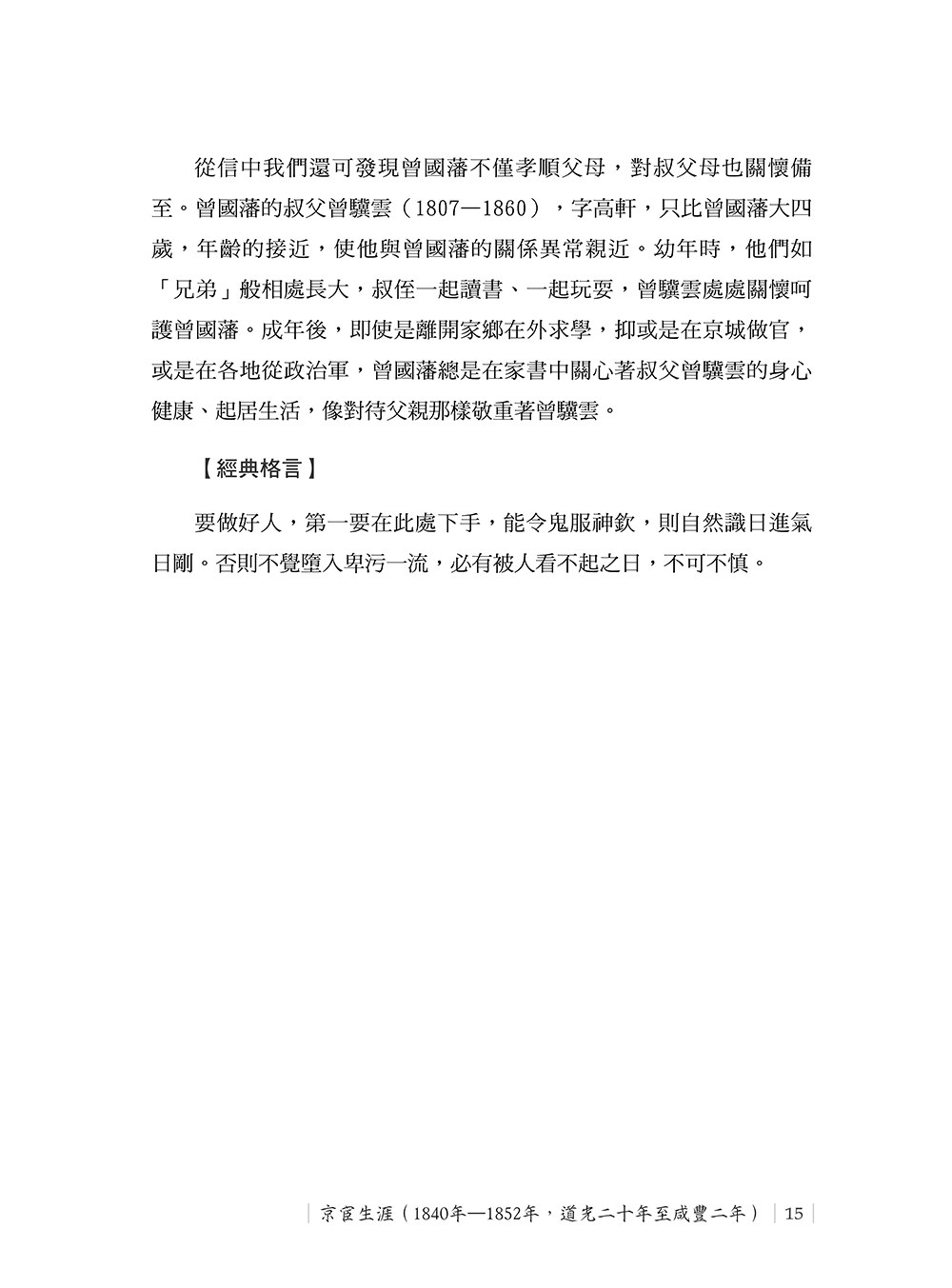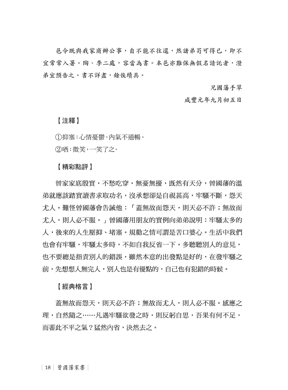 本書記錄了曾國藩自清道光三十年至同治十年前後,長達三十年的翰林院和從軍打仗生涯,精心選了近三百篇家書。上至祖父母、父母,中對兄弟,下及子侄,內容多為家務、勸誡,有國事,有政務,有軍事指示,有人物評論,還有讀書、寫字、作文的理念。儘管曾國藩著作留傳下來的不多,但僅這一部家書足以呈現出他的學識造詣和道德修養,從而贏得了「道德文章冠冕一代」的稱譽。