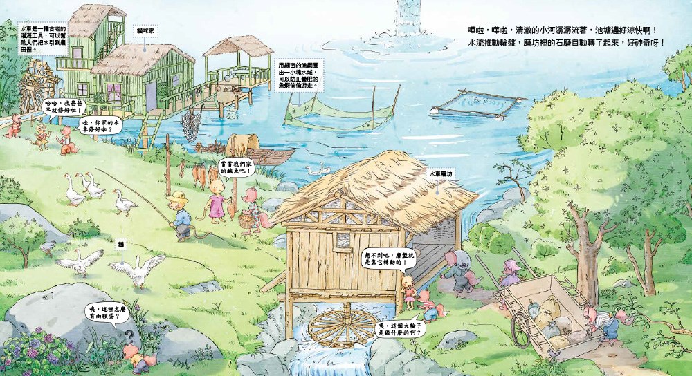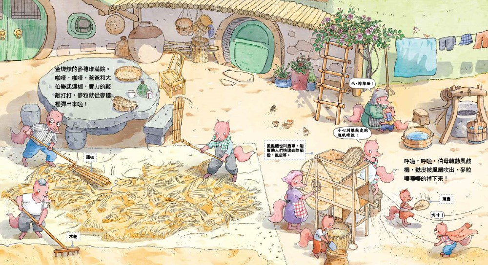 透過每一個不同的頁面,傳遞許多不一樣的知識,在不同季節,有不同的動物與植物,在小麥成熟時,麥田裡會看到瓢蟲、蝗蟲、田鼠、茉莉花、梔子花等等;小麥採收後,麥稈還可以廢物利用當燃料,將生活中的小常識,都畫在書中,透過閱讀,訓練觀察力,找找看繪本中有哪些重點與細節。