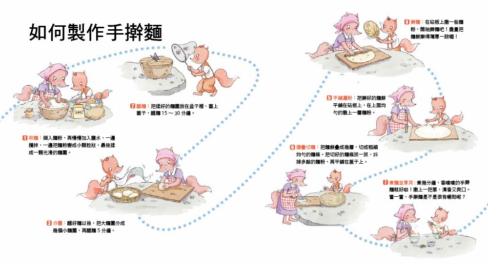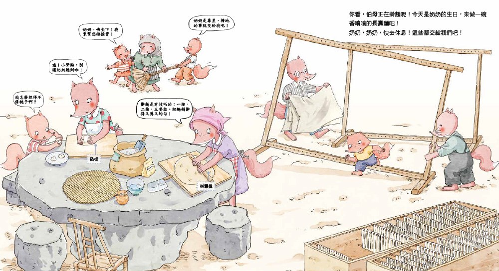 故事內容從小麥採收著手,接著敲打麥穗、脫殼、磨麵粉,最後動手揉捏麵團擀成麵條,把麵條從無到有的過程,用豐富、精緻的插圖,將生活百科融入日常生活中,讓孩子透過書籍,觀察周遭的一切,並與現實生活做結合。