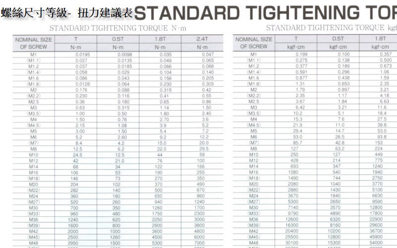 服務項目05 扭力單位換算對照,螺絲扭力建議表