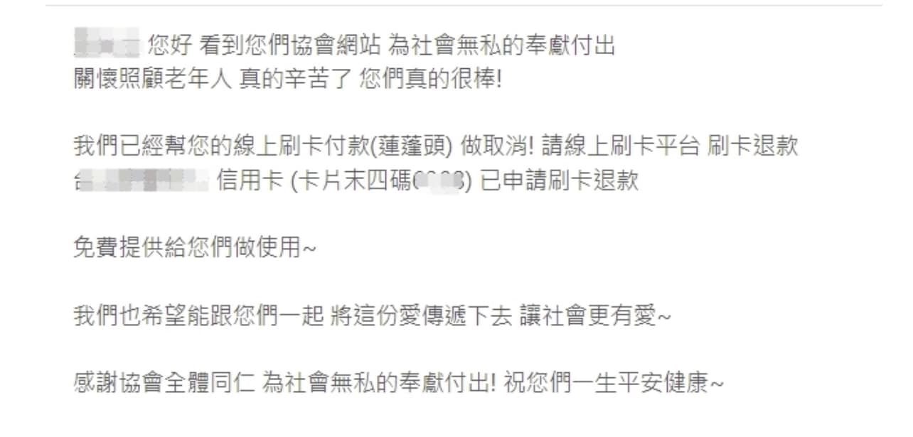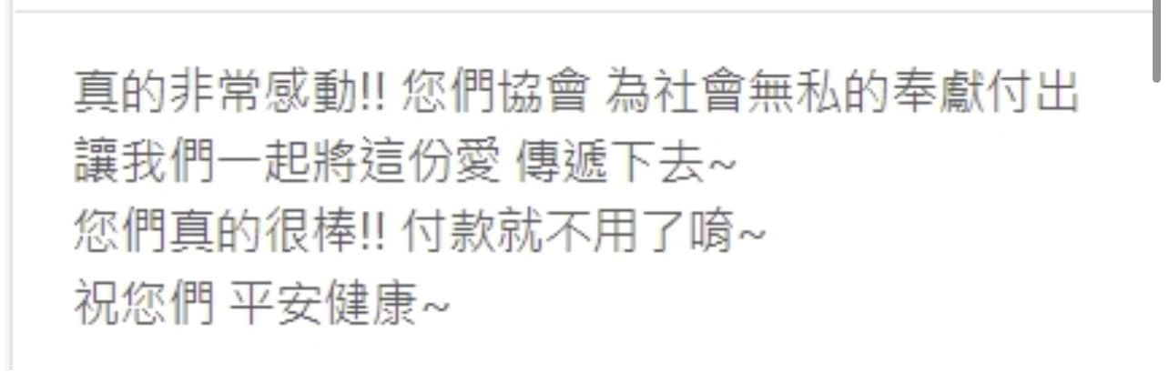 看到楊先生的留言後,讓人感到滿滿的溫暖,熱淚盈眶,雖然萬分感激但也明白在疫情的影響之下,大家賺錢都很辛苦,我們也再次表達希望能提供付款的方式,讓我們能支付商品的費用。然而楊先生堅持要奉獻並希望將❤️傳遞出去。