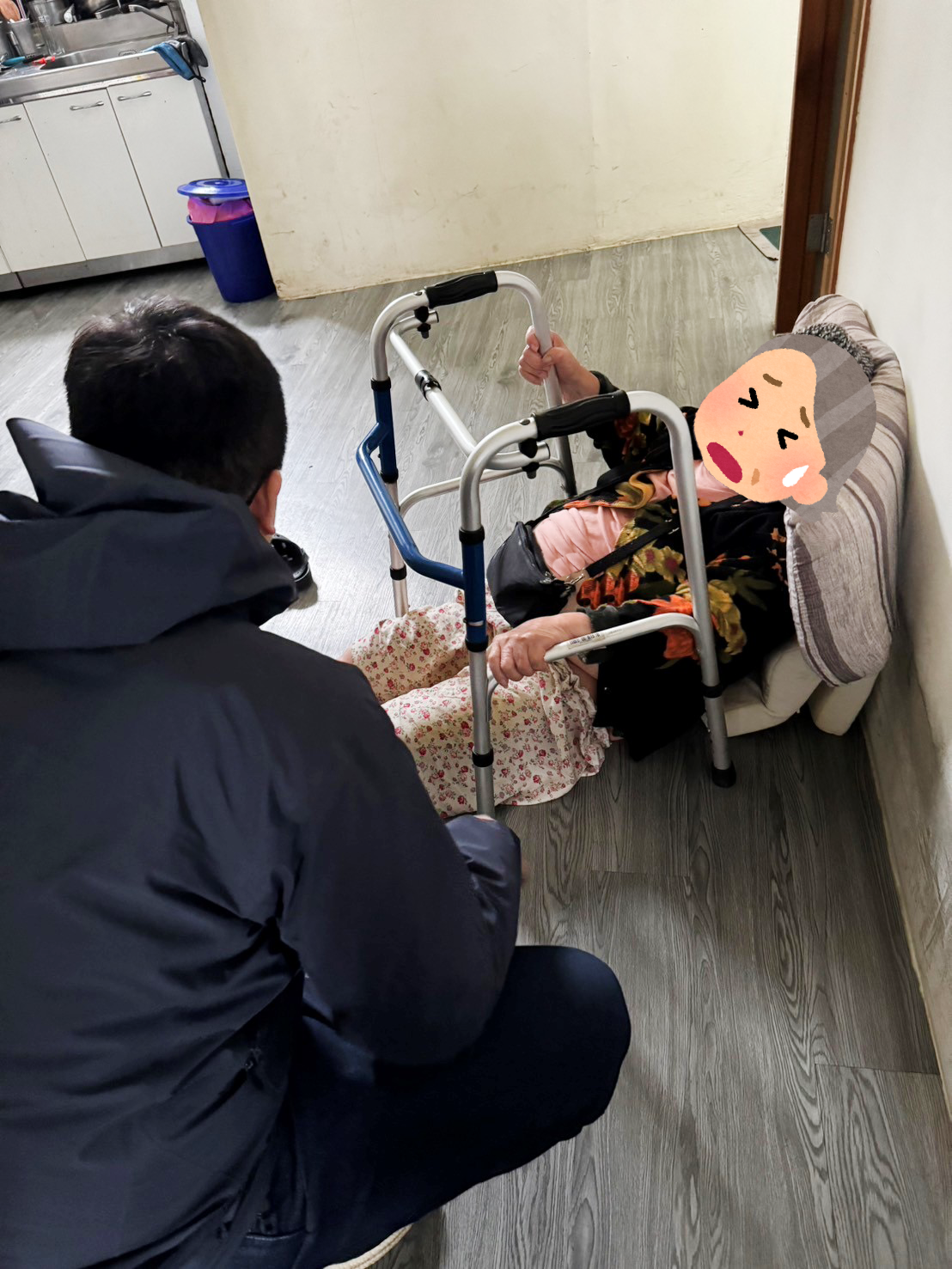 因為非常的緊急,所以協會的工作人員趕緊飛奔到案家探視阿嬤的狀況,幸好阿嬤的身體沒有明顯外傷,肢體也沒有扭曲變形,只是不曉得有沒有撞到頭部,這點連阿嬤都不清楚。
