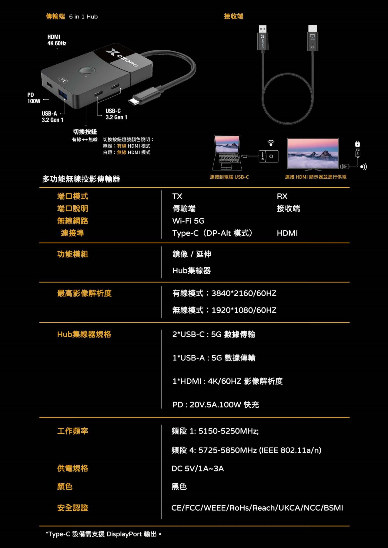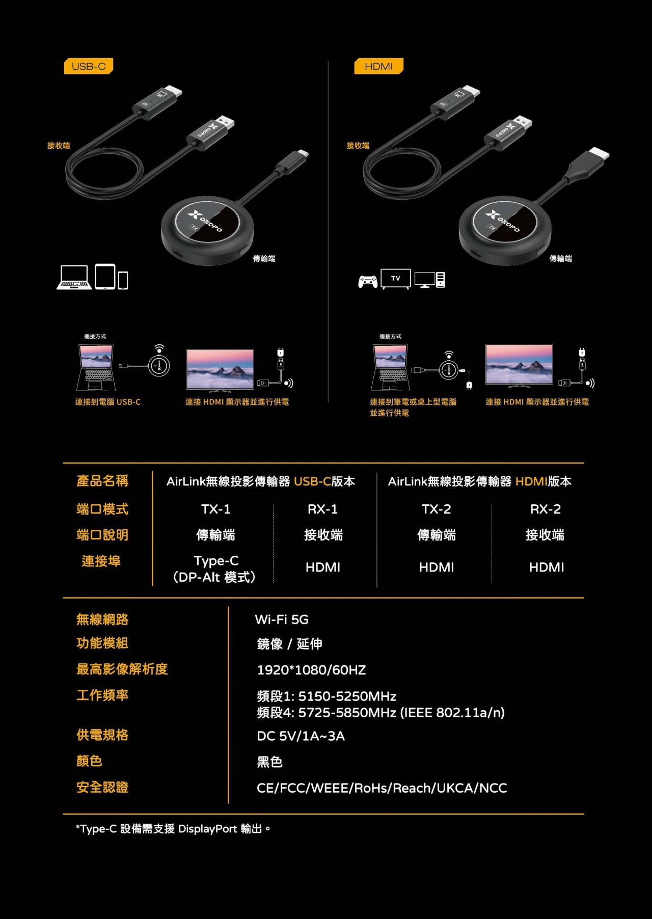 OXOPO AirLink無線投影傳輸器 USB-C/HDMI兩種版本