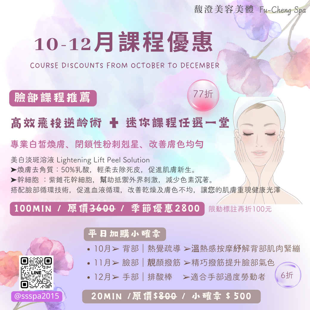 🔻官方LINE加入好友🔻@fucheng.spa 馥澄經典臉部管理:高效飛梭逆齡術 (SKIN CARE - F003) 【對症入座:此課程適合追求以下效果的您】 「高效飛梭逆齡術」是一項專為需要專業白皙煥膚、解決閉鎖性粉刺困擾,並渴望改善膚色均勻的顧客所設計的高效臉部療程。如果您發現肌膚乾燥、膚色暗沉不均,或需要深度角質代謝與淨化,這將是您的理想選擇。 【專業深度與成份解析】 本課程透過精準的科技保養流程,為您的肌膚帶來由內而外的光澤: 高階煥膚去角質: 我們使用專業的美白淡斑溶液(Lightening Lift Peel Solution),其中含有 50%乳酸。乳酸能輕柔且有效地去除老舊死皮細胞,促進肌膚的新生活力,而非僅是表面的清潔。 抗壓與修護機制: 課程搭配了具備強大防護力的 紫錐花幹細胞。這項成分有助於肌膚抵禦外界環境的刺激,並從源頭減少色素沉著的產生。 深度循環技術: 透過專業的臉部循環技術,有效促進血液循環,這對於改善乾燥、提升肌膚光澤與水潤無瑕感至關重要。 【療程價值與預約資訊】 深度流程:涵蓋聞香靜心、清潔、粉刺吸引、循環按摩、PEEL煥膚、敷臉、精華導入、以及長達 10分鐘的頭肩頸按摩。