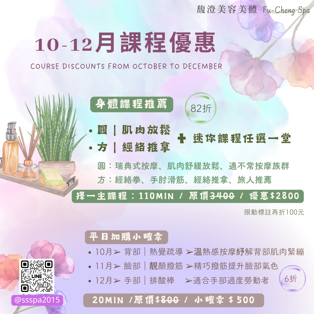 我們隆重推出 10月至12月身體高效釋壓專案,讓您在 110分鐘 內,選擇最適合您的主課程,再搭配迷你課程任選一堂,享受原價 $3400,季節優惠 $2800 的超值呵護!