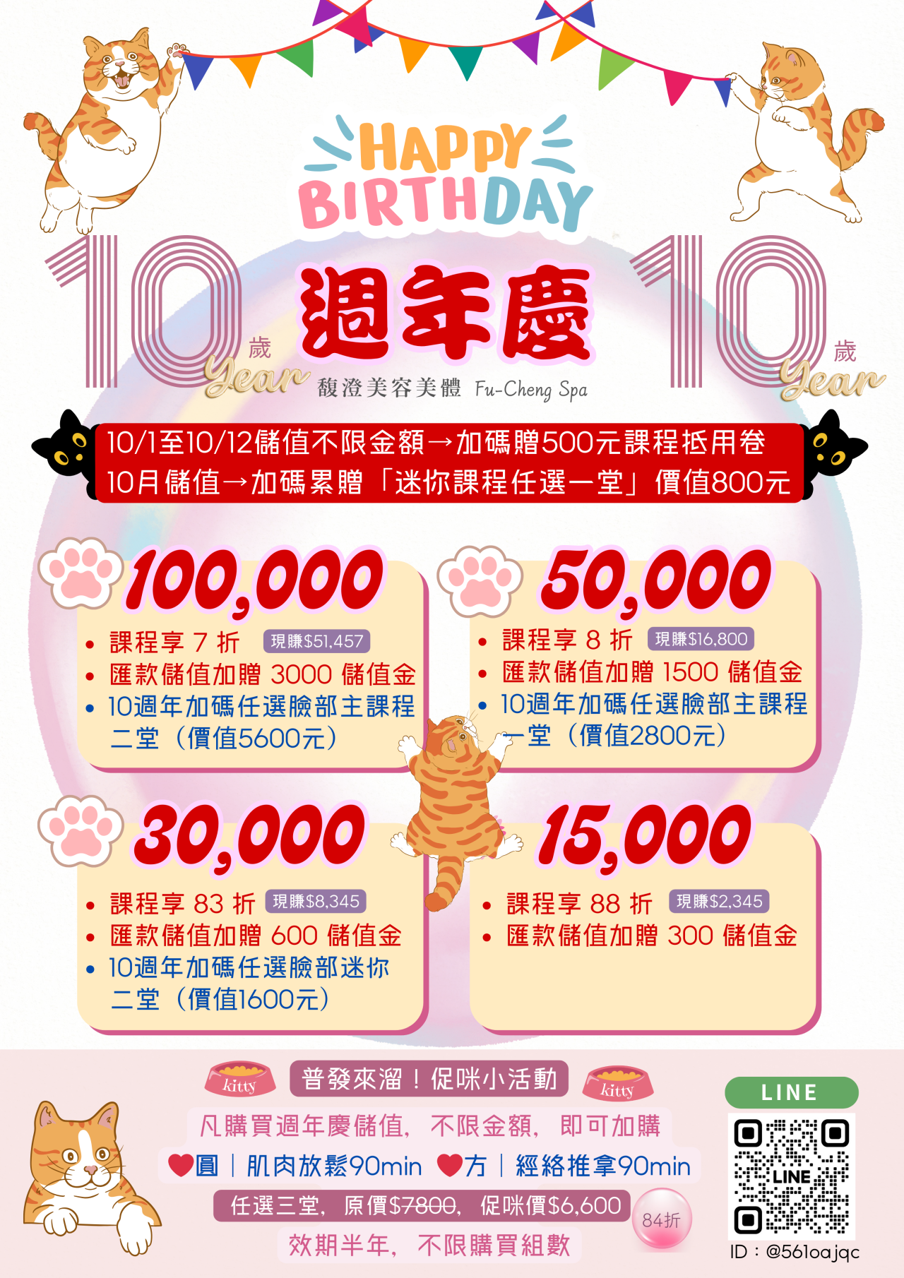 @fucheng.spa 【馥澄10週年慶🎉】 馥澄美容美體感謝澄友們10年的支持與陪伴!今年推出超值回饋活動,#儲值不限金額最高享7折優惠,更可超值加購#肌肉放鬆或#經絡推拿三堂課程,原價$7800,優惠價只要$6600!馥澄秉持#不推銷的宗旨,讓您在無壓力的環境中享受極致放鬆。 限時優惠只到11月底,立即預約 ♬ 原聲 - 馥澄美容美體Fu-Cheng Spa