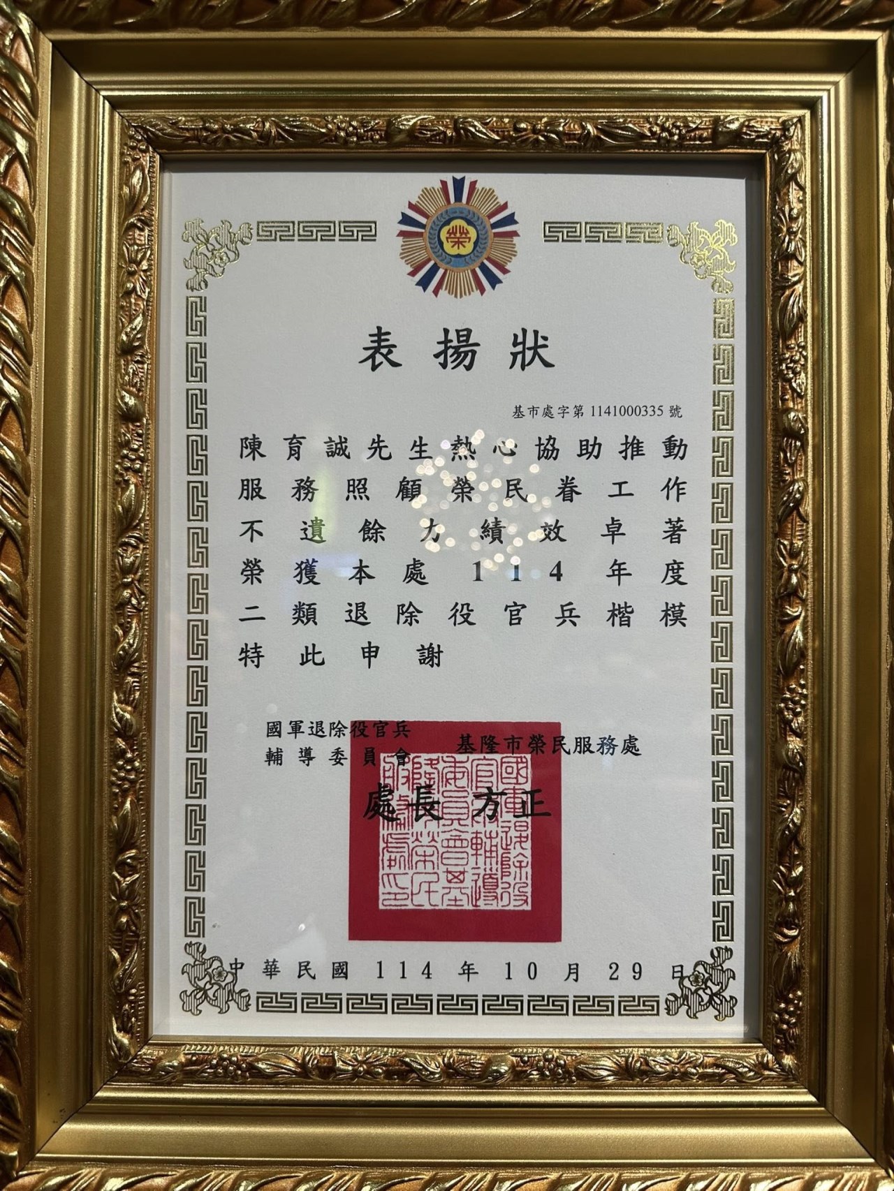 感謝基隆榮服處,頒發第一位,第二類退除役官兵楷模(榮民楷模)。