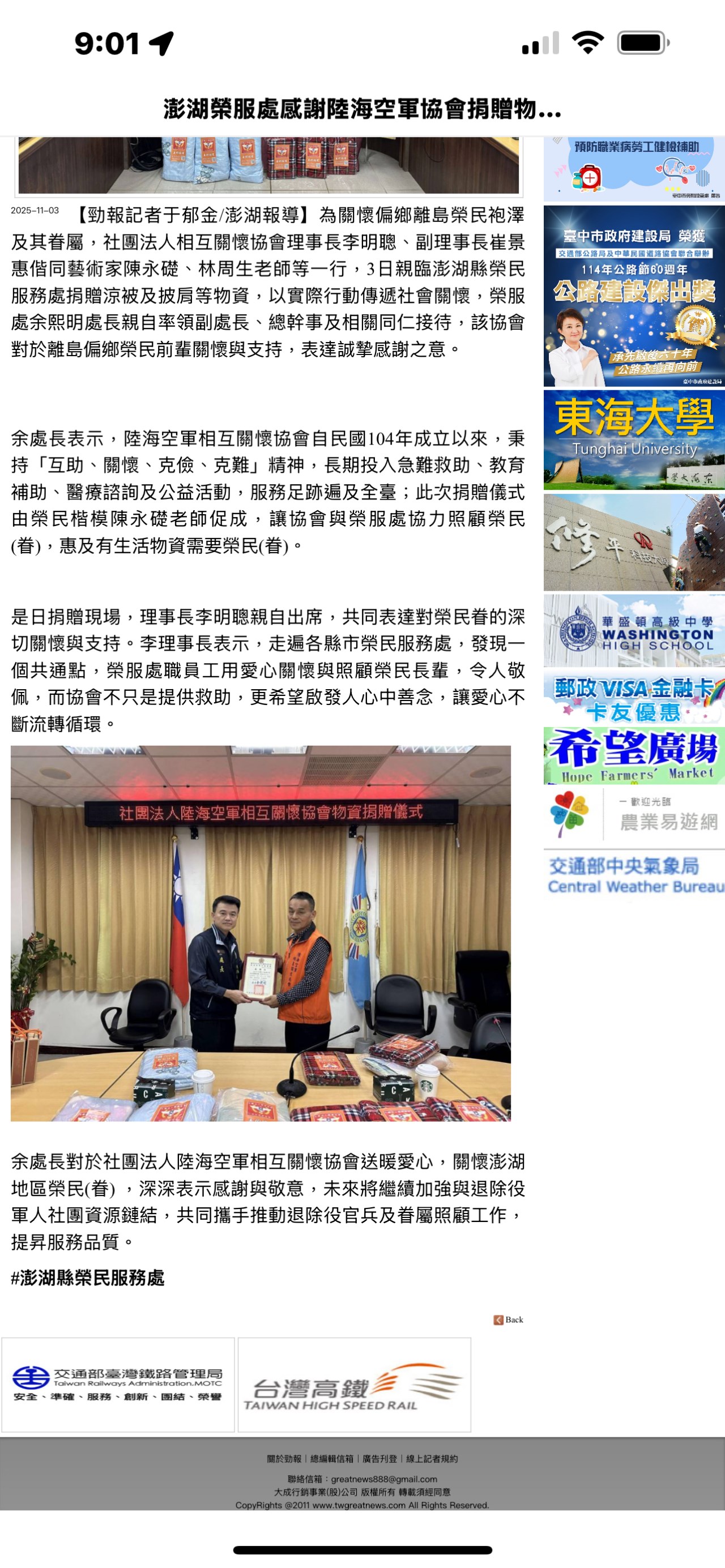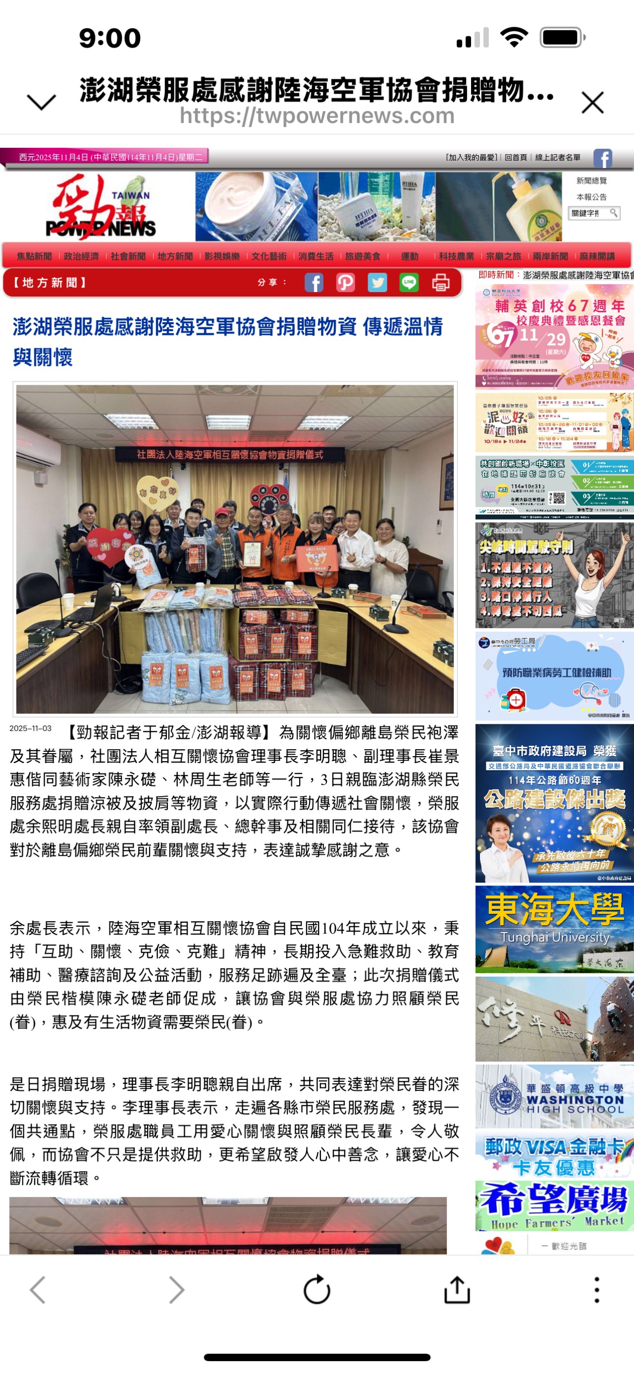 余處長對於社團法人陸海空軍相互關懷協會送暖愛心,關懷澎湖地區榮民(眷) ,深深表示感謝與敬意,未來將繼續加強與退除役軍人社團資源鏈結,共同攜手推動退除役官兵及眷屬照顧工作,提昇服務品質。