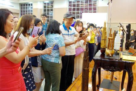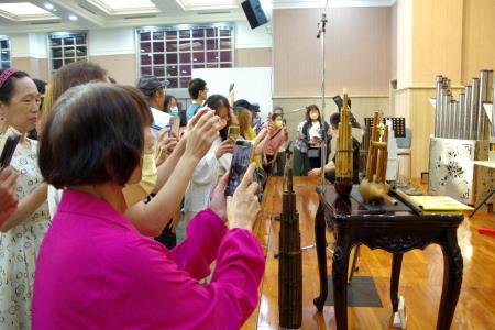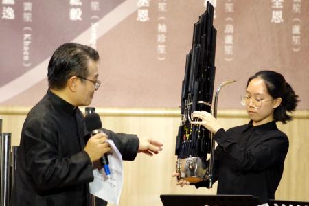 黃朧逸老師以熱情生動又平易近人方式,除了介紹了中國笙的歷史、構造、特色之外,也比較了與泰國笙、馬來西亞笙的異同,透過講解與現場演奏,除了欣賞笙的特別音色與特別為笙編曲、創作的曲目,各個大、小形製不一的笙,也讓大家大開眼界;會後合照時,老師也大方提供笙讓大家手持合照。
