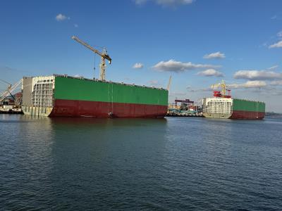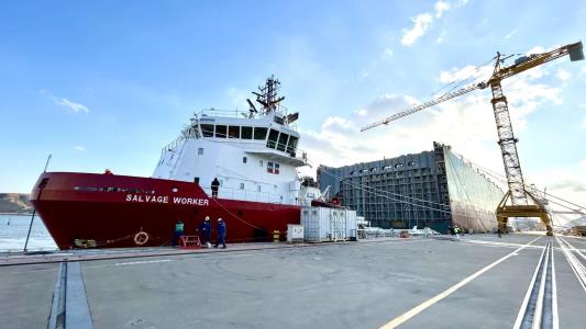 Salvage Worker conducted the towage of the barge "TERA BLOCK" from Dalian, China, to Geoje, Korea, on Dec. 27, 2024. This barge is of a monstrous scale, and the towing arrangement was revised multiple times to ensure safety. On the first day, when our crew arrived in Dalian, they worked until midnight to install the towing gear onto the barge under extremely cold weather.