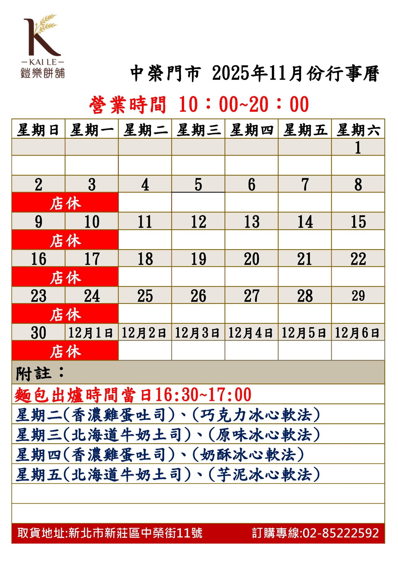 2025年11月份化成門市行事曆