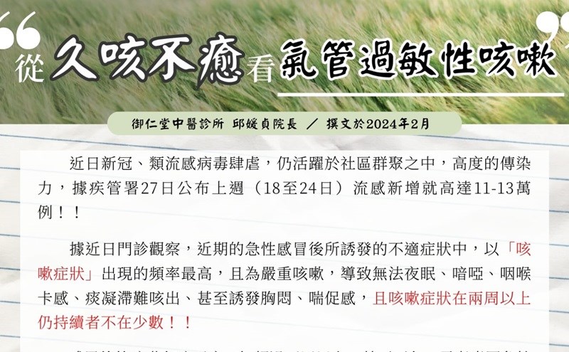 據近日門診觀察,近期的急性感冒後所誘發的不適症狀中,嚴重咳嗽症狀頻率高,導致無法...