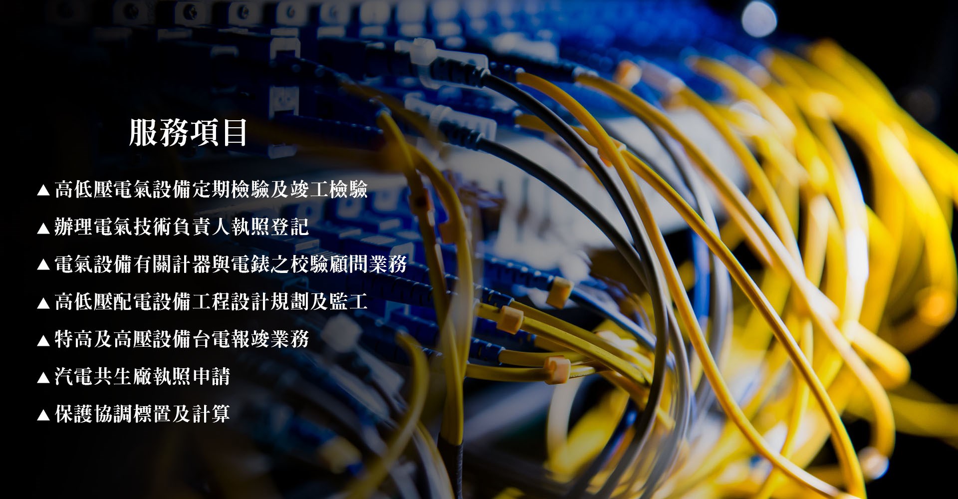 高低壓電氣設備定期檢驗及竣工檢驗 辦理電氣技術負責人執照登記 電氣設備有關計器與電錶之校驗顧問業務 高低壓配電設備工程設計規劃及監工 特高及高壓設備台電報竣業務 汽電共生廠執照申請 保護協調標置及計算