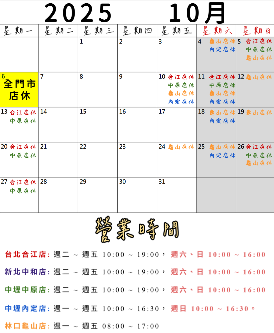台北合江站星期二~星期日 AM10:00~PM07:00,星期一固定店休