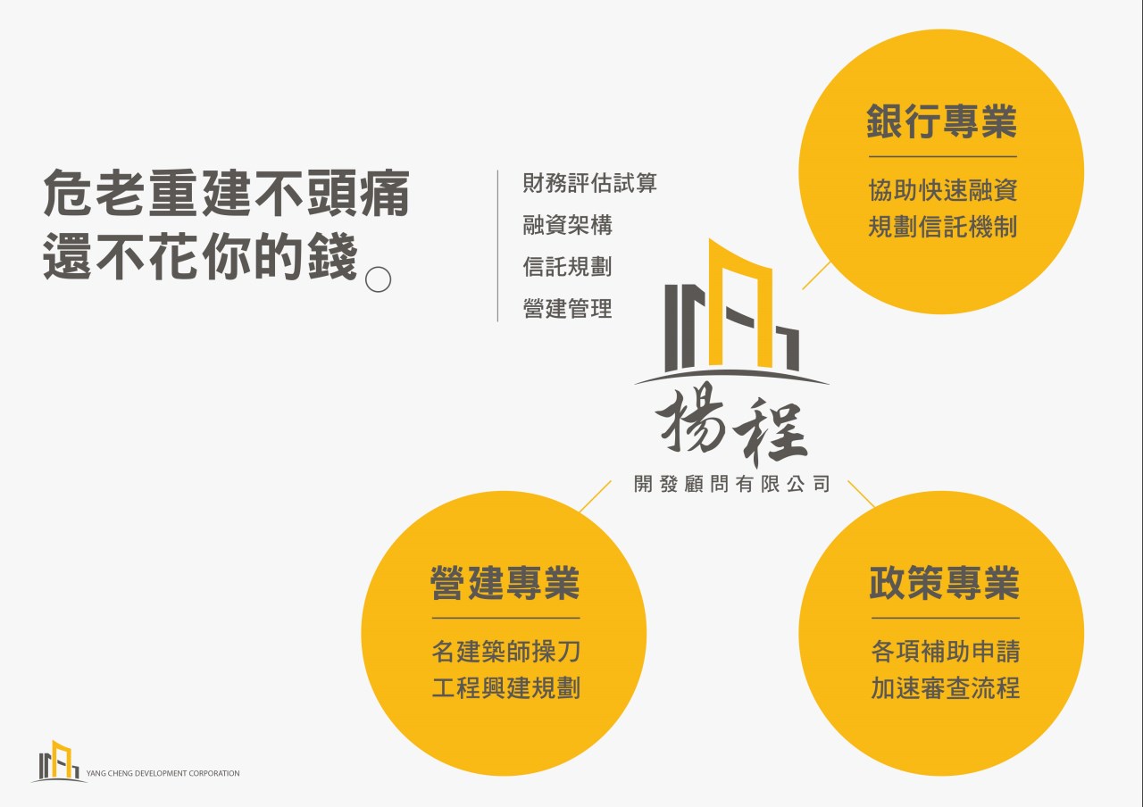 揚程具有都市更新及危老重建的專業顧問能力,致力於推廣老屋自主更新、危老重建,並輔導地主[自地自建]。