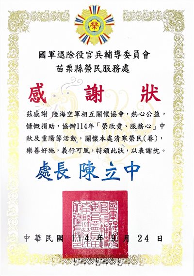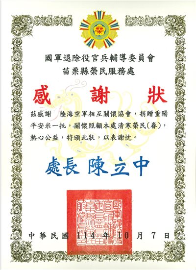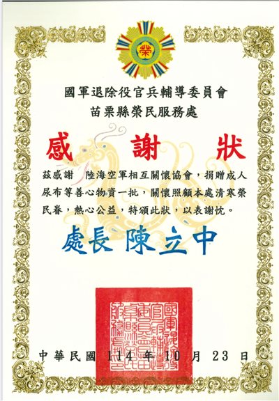 苗栗榮服處感謝陸海空軍相互關懷協會捐贈
