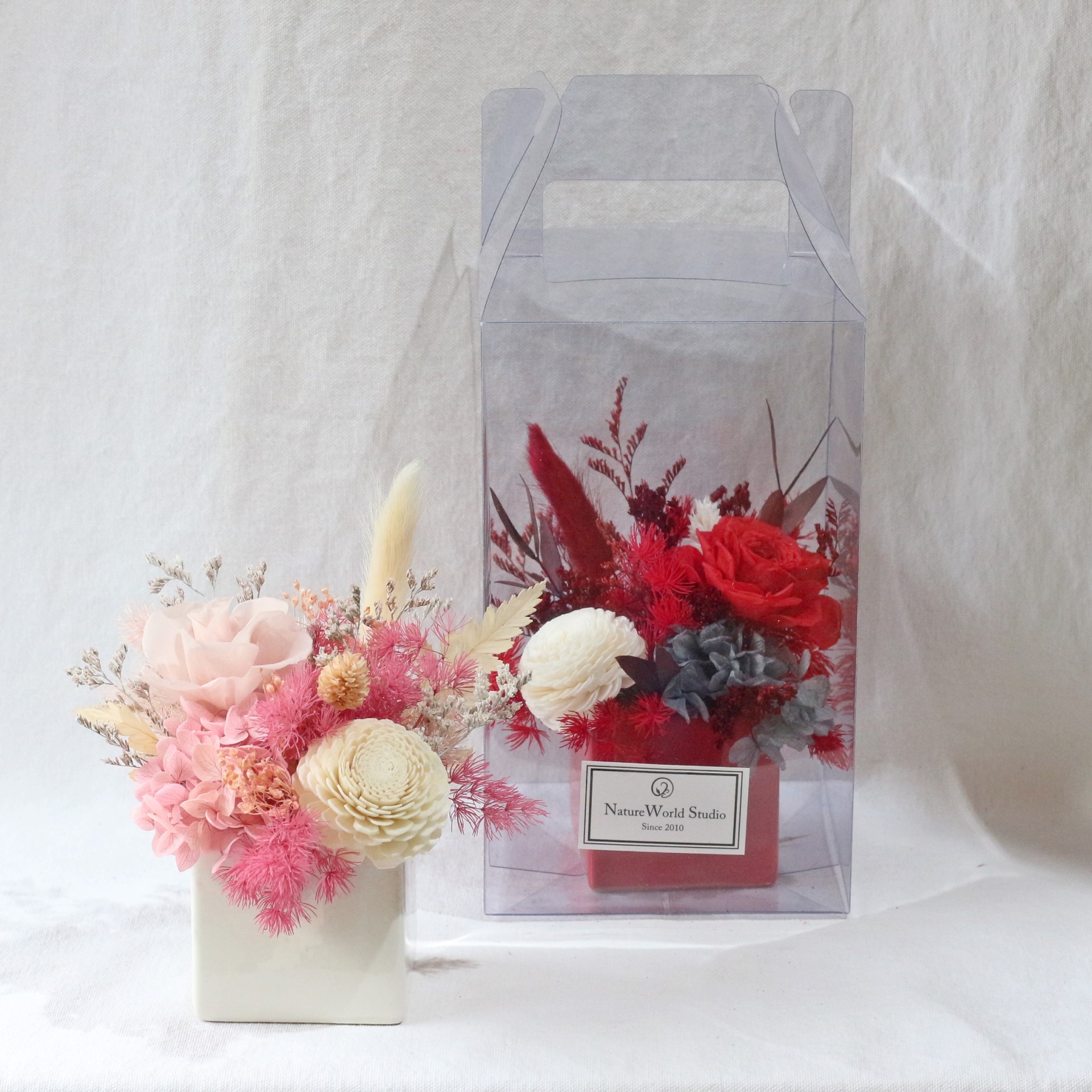 【商品規格】 品牌 : 原生態 NatureWorld 桌花尺寸 : 長10x寬10x高15cm 提袋尺寸 : 長12x寬12x高17cm 透明盒尺寸 : 長12x寬12x高27cm 材料: 瓷器盆,索拉花,乾燥花,永生花 適合環境 : 乾燥環境 產地 : 台灣 滴上精油的揮發時間 : 3~5天